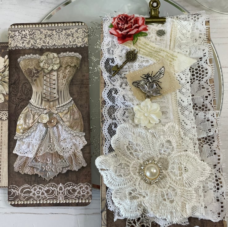 Flip folder decorated with lace and a crochet doily. Plenty of pockets and tags. Each tag has a bulb pin and charm/ Clipped together with a mini bull dog clip and ribbon. Measures 6.75" x 3.5"