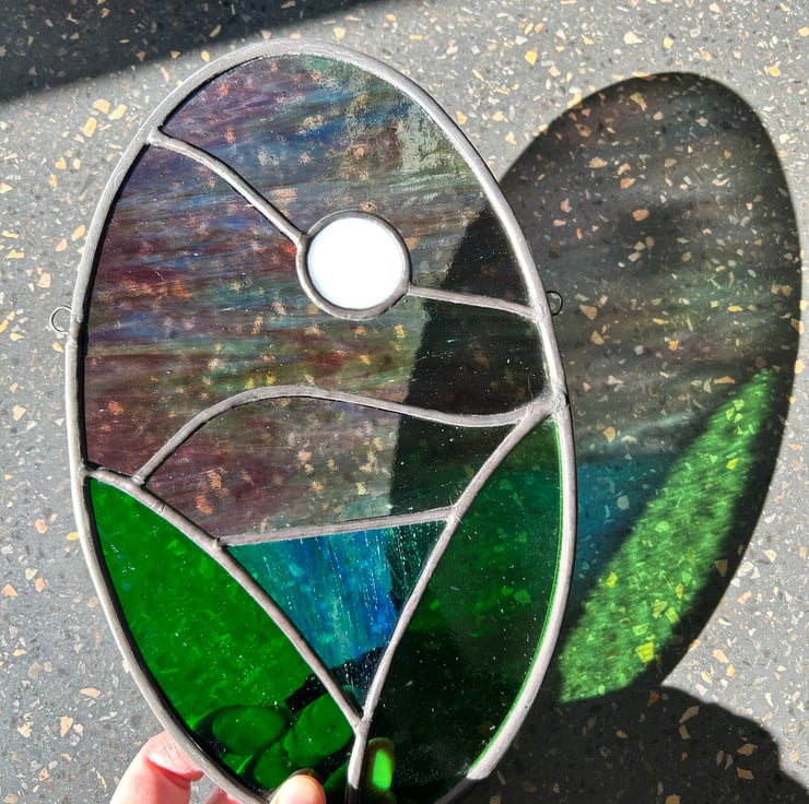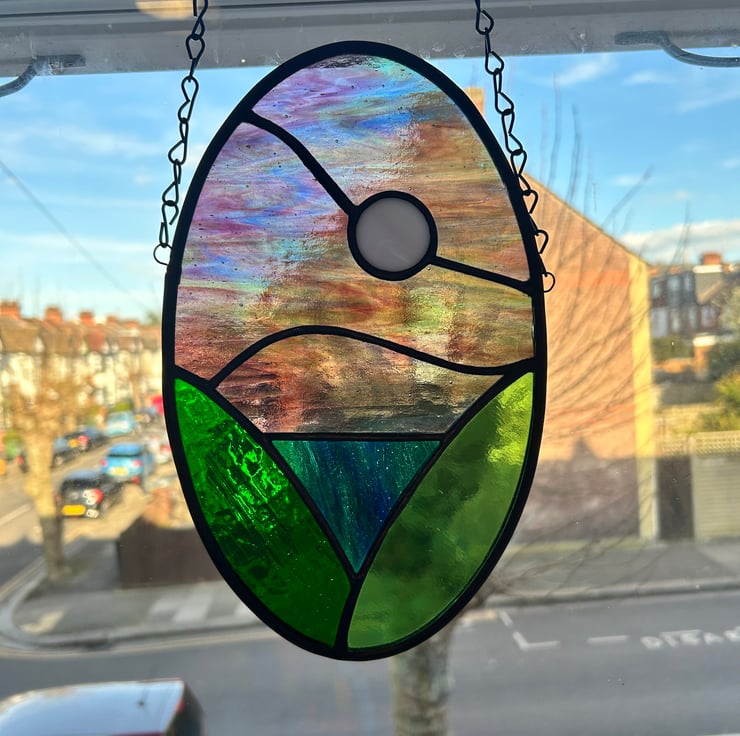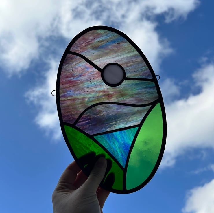 A glowing full moon hangs over a dreamy night sky, casting its light on the quiet landscape below. Handcrafted with a wispy multicoloured glass, this oval stained glass piece captures the magic of the night. Whether hung in a window or displayed on a wall, it brings a peaceful, celestial touch to any space.