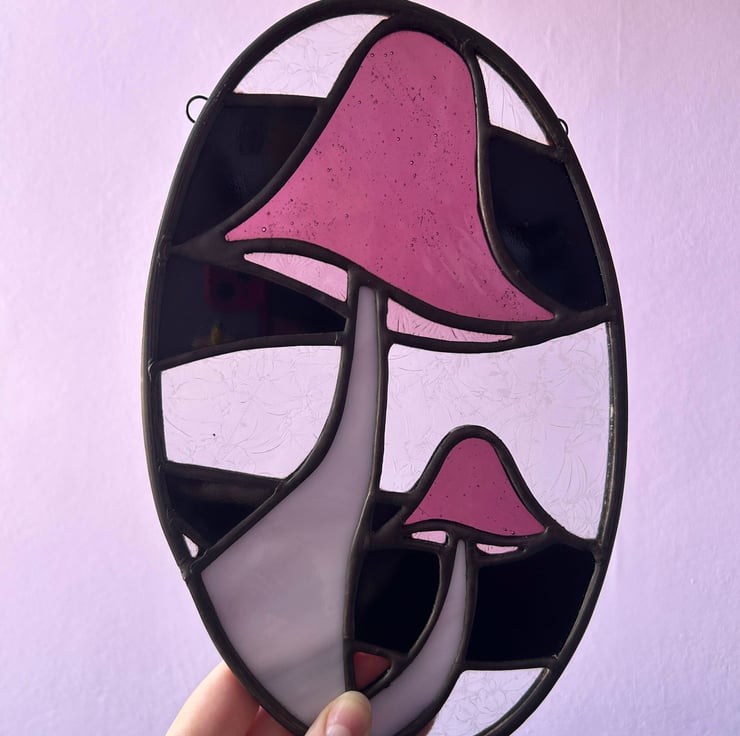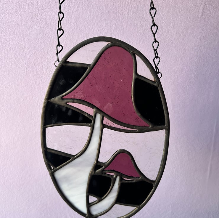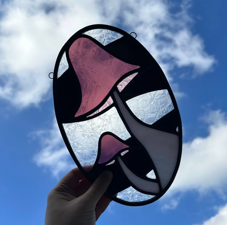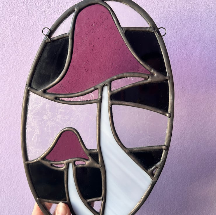 Two purple mushrooms hanging out together in an oval panel, with a mix of black and clear textured glass in the background. The textures play with the light, making the mushrooms pop and giving the whole piece a bit of a spooky, magical vibe. Handmade in my home studio, ready to bring some fungi charm to your space!