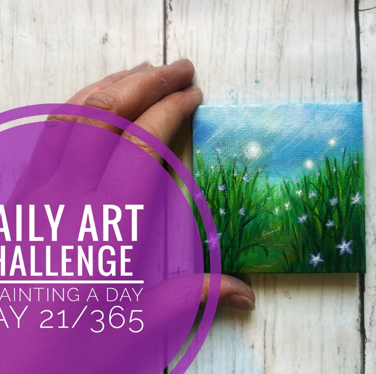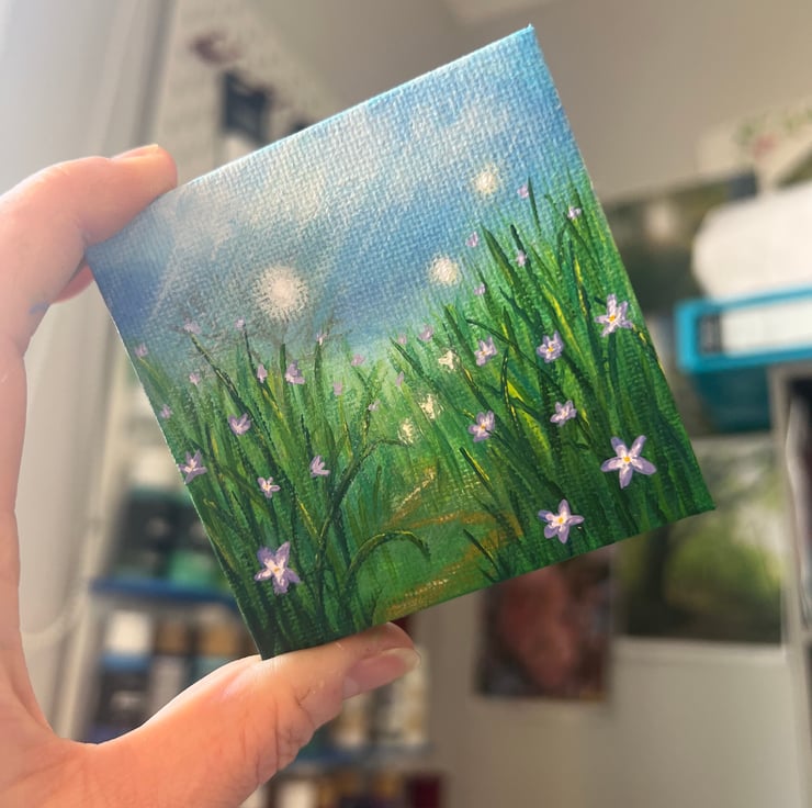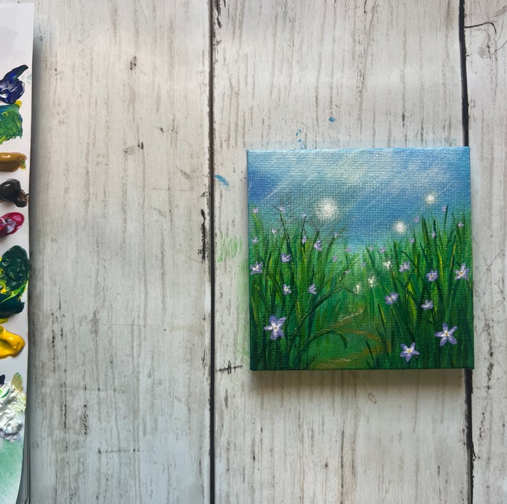 Today’s mini painting captures a pretty fairy garden filled with bluey-purple periwinkle flowers, inspired by the clumps of them I spotted on my morning walk.