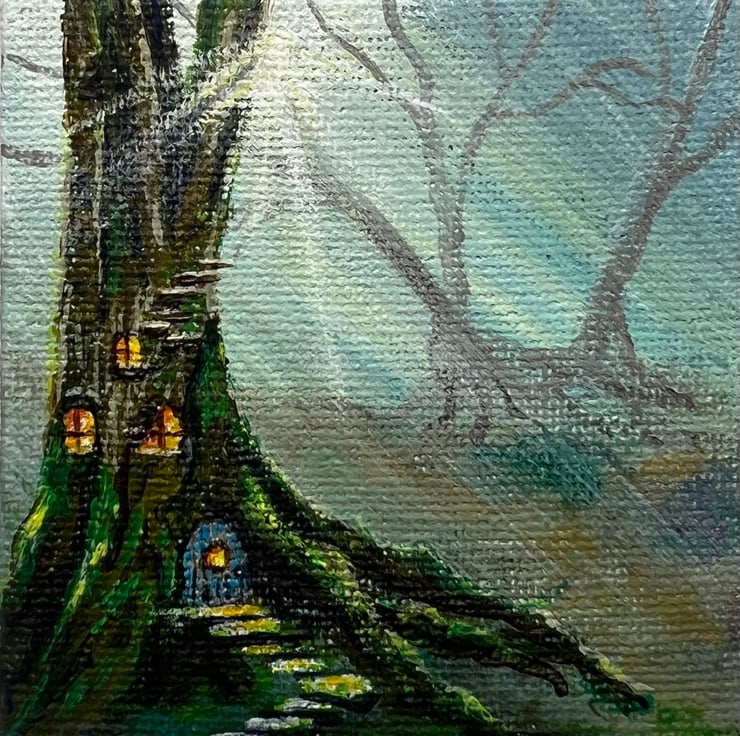 Today’s painting is of a fairy house nestled into the side of a tree, with a charming blue door and windows glowing with cosy light, inviting you into a secret, magical world.