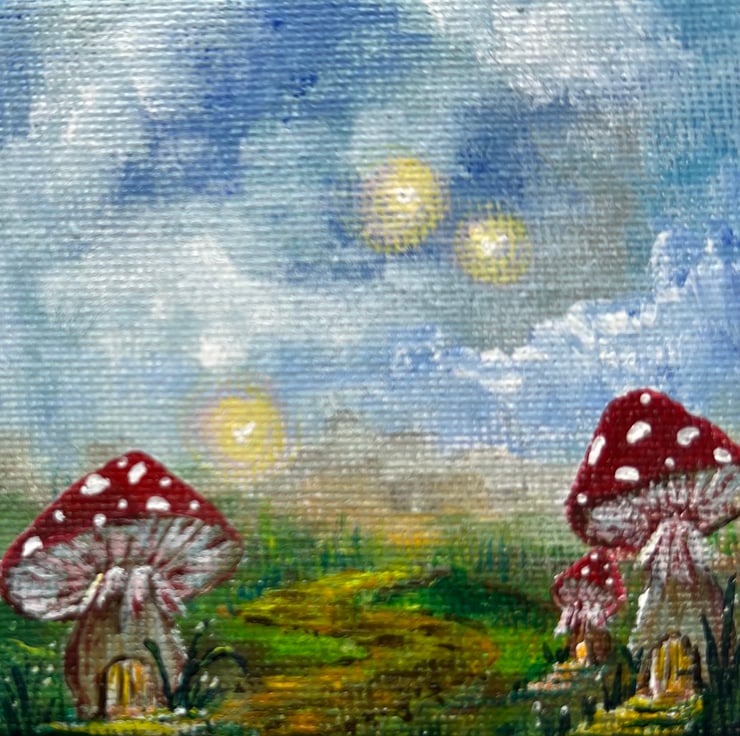 In this piece, three red and white toadstools with little yellow doors stand proudly at the edge of a fairy road, inviting wandering sprites and curious souls alike. Overhead, three glowing fairy orbs dance playfully against a classic Scottish sky, creating a whimsical and enchanting scene.