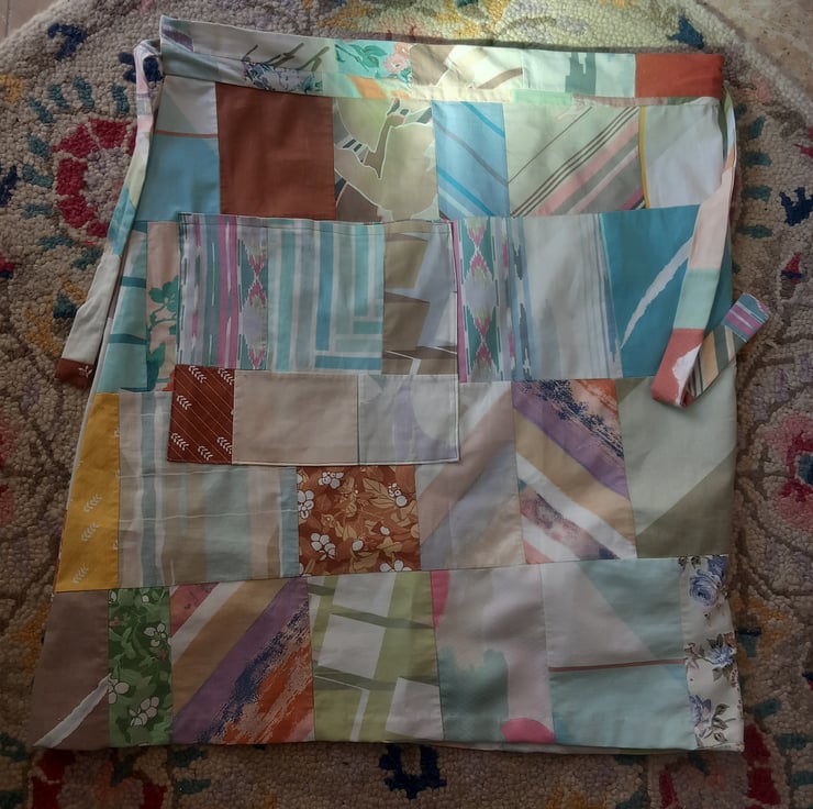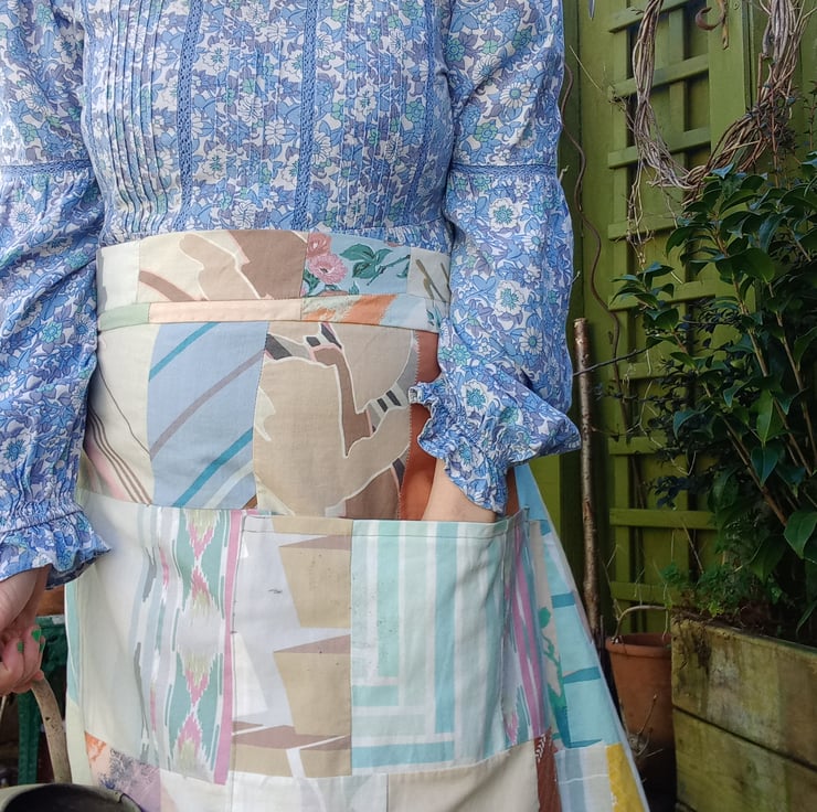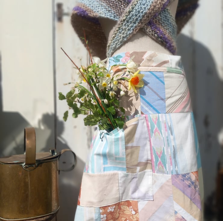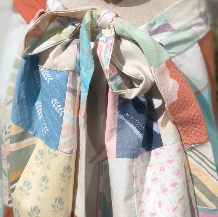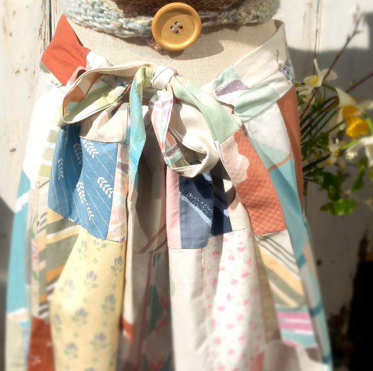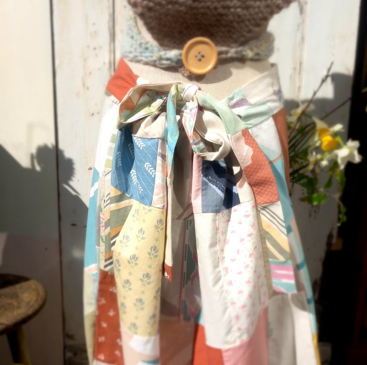 In beautiful packwork vintage fabric taken from my own skirt patten. It has an adjustable waist as it pulls to a gather at the back. To extend the length wear a petticoat under neath showing . All seams are overlocked. A big oversized pocket at the front. Wide comfortable waist band. Waist 64 cm cm.wide that pulls together to tie at the back. Length 77cm