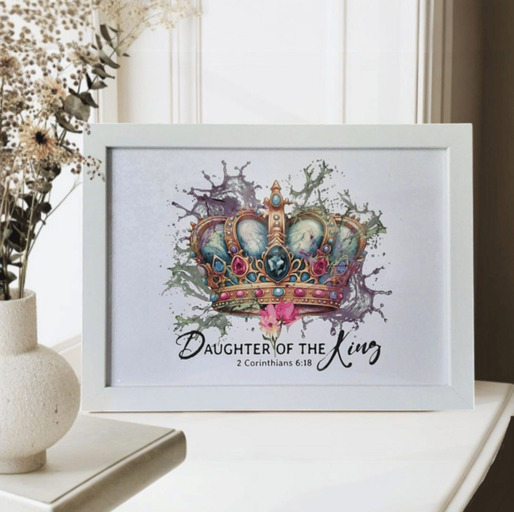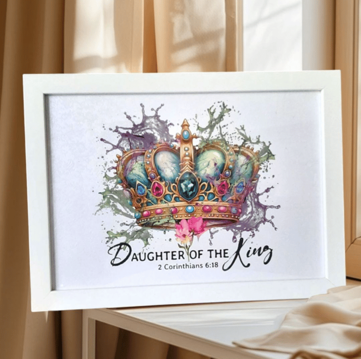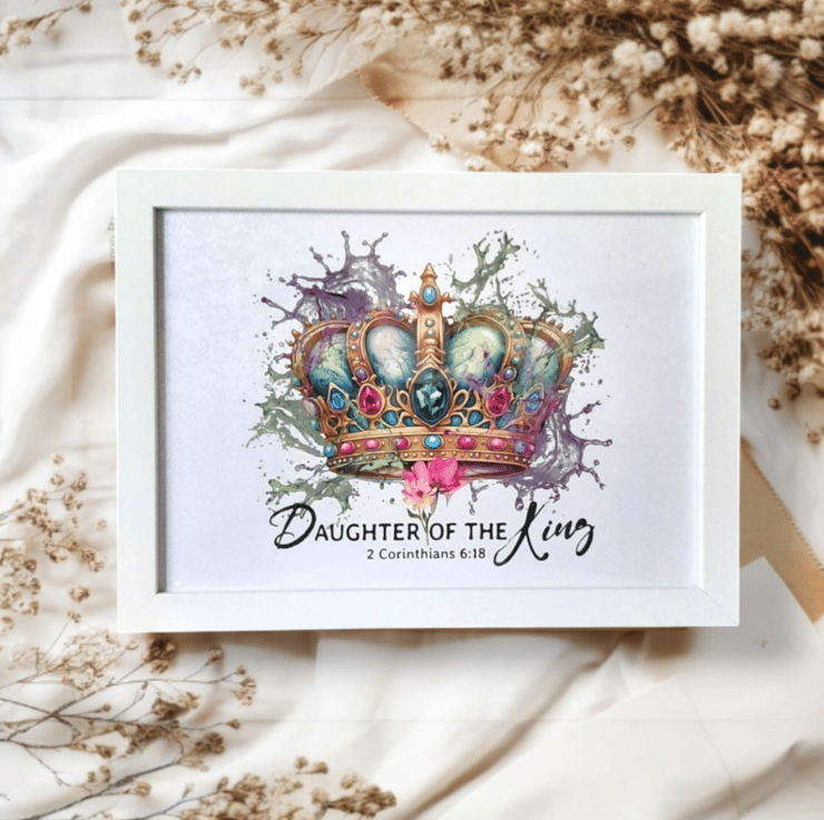 Looking for a religiously inspired piece of wall art that's both artful and perfect for gifting? Then look no further! This beautiful "Daughter of the King" print, inspired by 2 Corinthians 6 18, is a stunning addition to any home decor. It's more than just a print; it's a declaration of faith, a reminder of your identity in Christ, and a beautiful piece of religiously themed artwork. This print is created using high-quality printing process, ensuring vibrant colors and crisp details that will last. Printed on premium, heavyweight card, this wall art boasts a luxurious feel and a professional finish. The design itself is simple yet elegant, making it a versatile piece that complements a variety of interior styles. Imagine this stunning piece adorning your wall, a constant source of inspiration and a testament to your faith. It's a wonderful gift for birthdays, anniversaries, graduations, or simply as a "just because" present for a loved one.