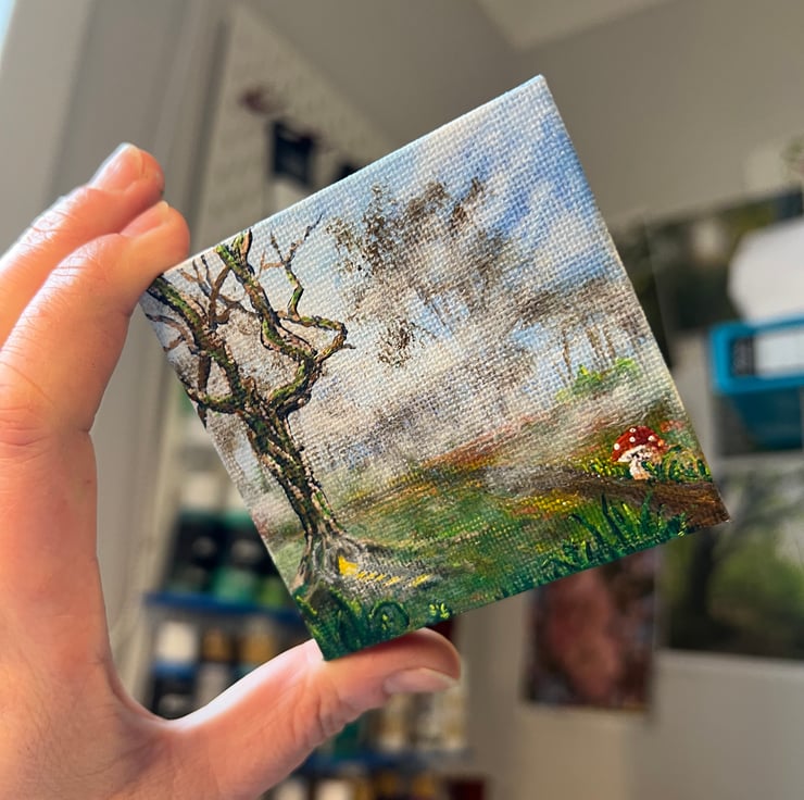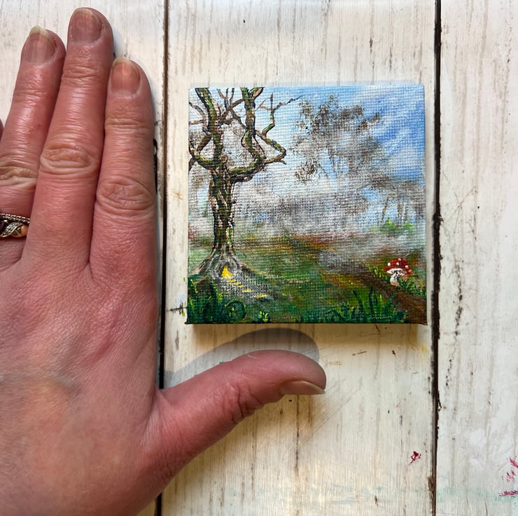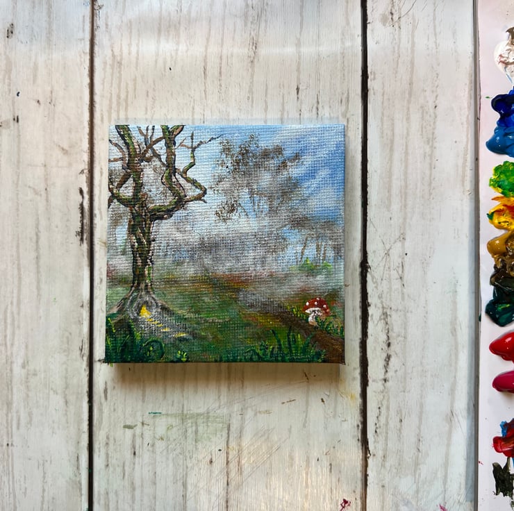 A red and white toadstool nearby adds a playful touch, completing this peaceful scene shrouded in gentle mist. A little moment of stillness and wonder captured on canvas