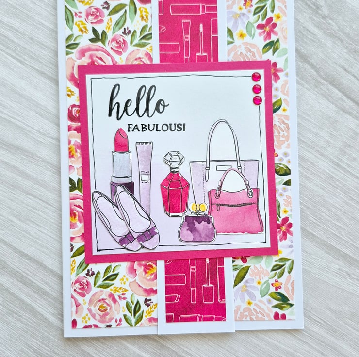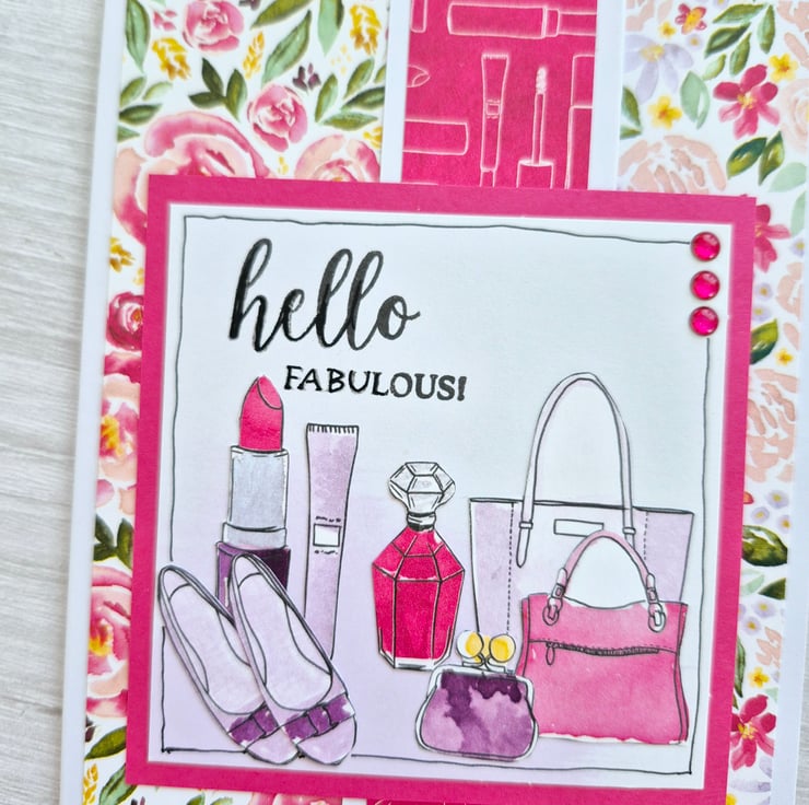 A6 size pretty flip front floral girly card suitable for ladies of all ages. Flowers, Make-Up, Perfume, Shoes and Bags ! Finished with some gems.