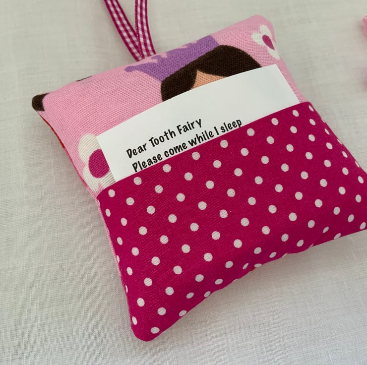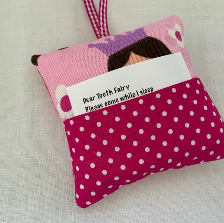 A lovely little cushion which can be popped under a pillow or hung beside the bed. Perfect for keeping little teeth safe until the tooth fairy collects and leaves a little gift in the pocket.