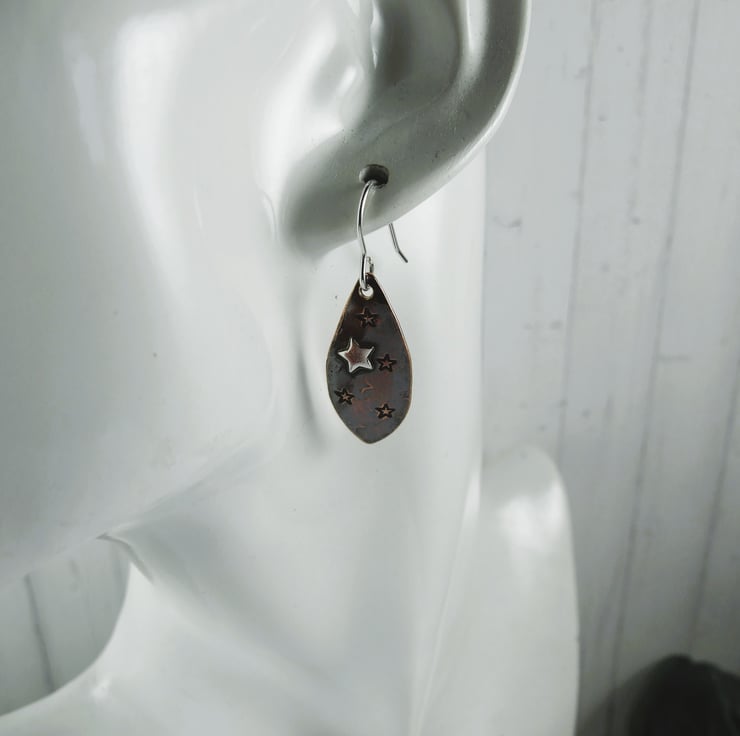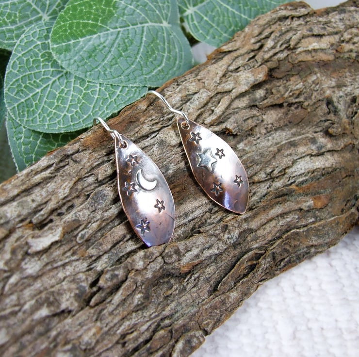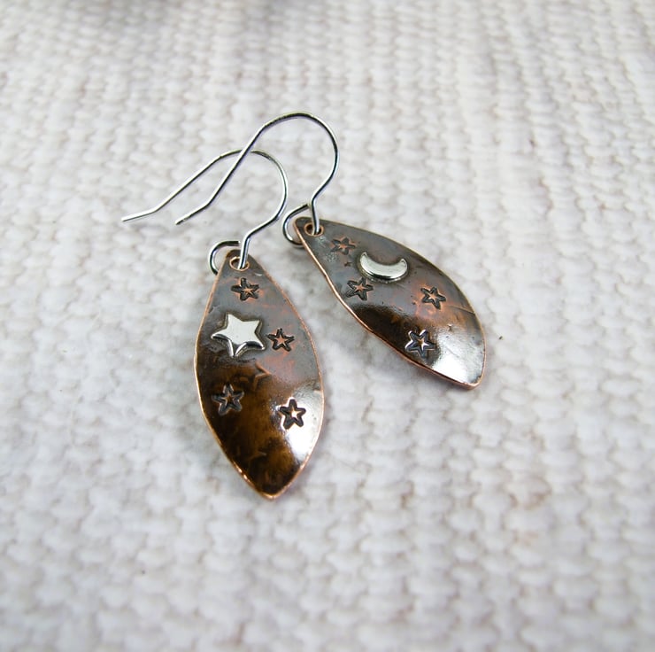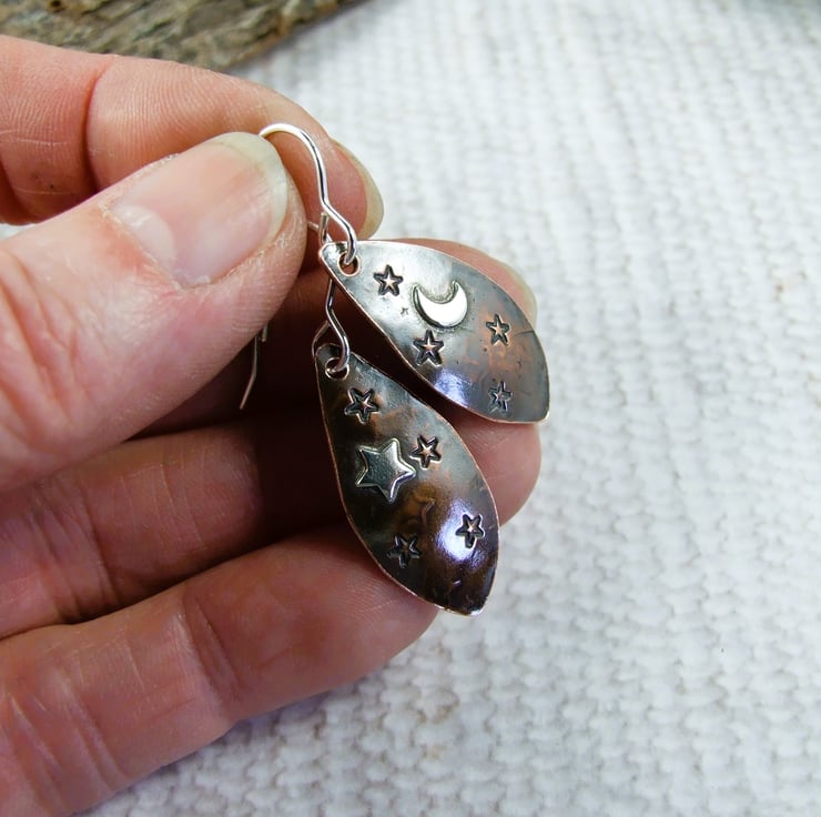 I have created the dropper shapes from copper sheet, hand cut and textured with a hand tool and stamped with lots of stars. I then soldered a little silver moon to one earrings and a star to the other. Fitted to sterling silver ear hooks