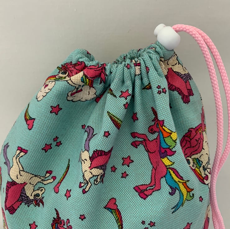 Drawstring wash bag, toiletry bag. Cotton exterior with nylon waterproof lining and fitted with a toggle to hold the bag closed.