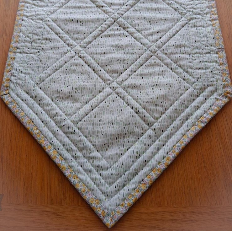 I love making table runners! For me, they are the perfect combination of patchwork piecing and quilting. Once I’ve settled on a design, I really enjoy selecting fabrics that will contrast and compliment each other. I then cut them up and sew them back together in a different order! My artistry doesn’t end there though, because I then consider how to quilt the piece. Sometimes I decide on a relatively simple grid or straight lines design, whereas other times I might quilt an all-over free motion design of swirls, leaves or perhaps something else!