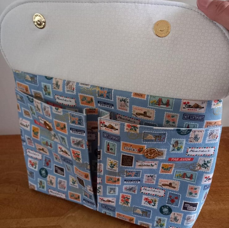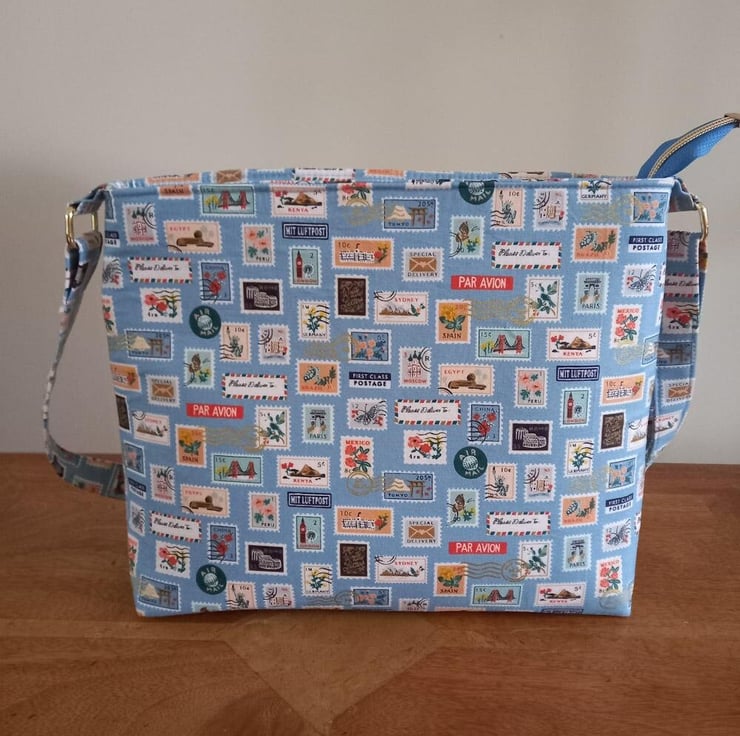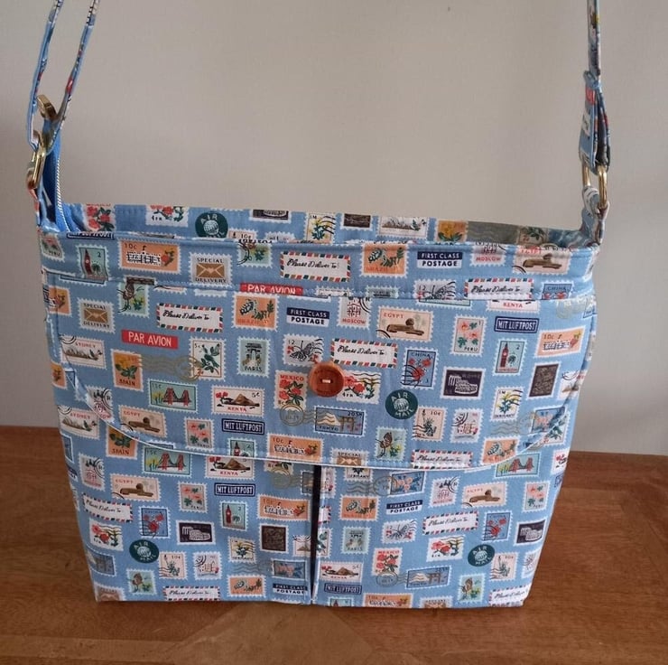 Satchel style Postage Stamps fabric shoulder bag. Made with a blue and cream postage stamp print cotton fabric and a co-ordinating cream cotton lining, it features multiple pockets including two front cargo pockets, an internal slip pocket with three compartments and an internal zipped pocket.