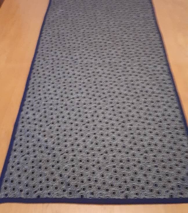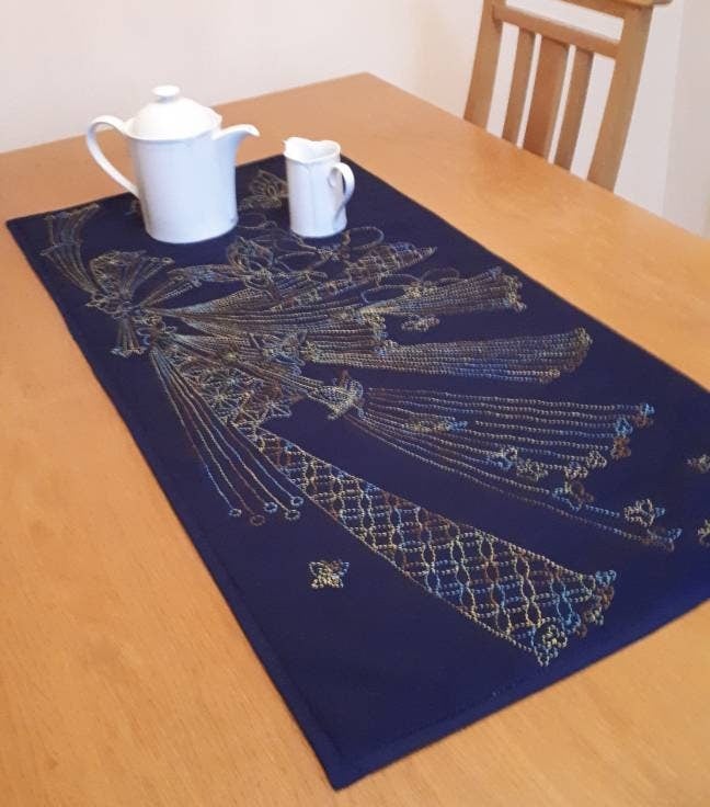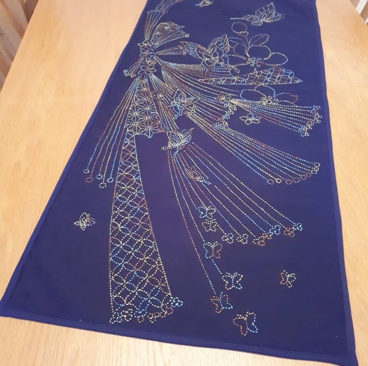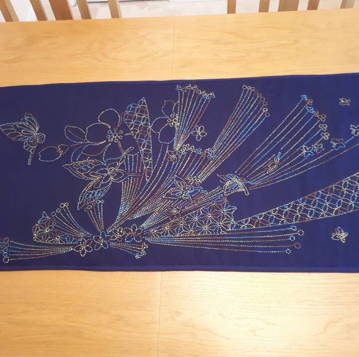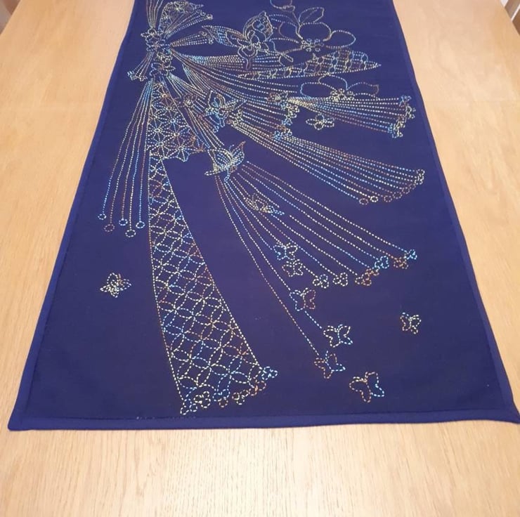 Beautiful hand embroidered table runner with a colourful butterflies and flowers design on a dark blue background on one side and a navy and grey spot print fabric on the reverse. Entirely hand embroidered by myself.