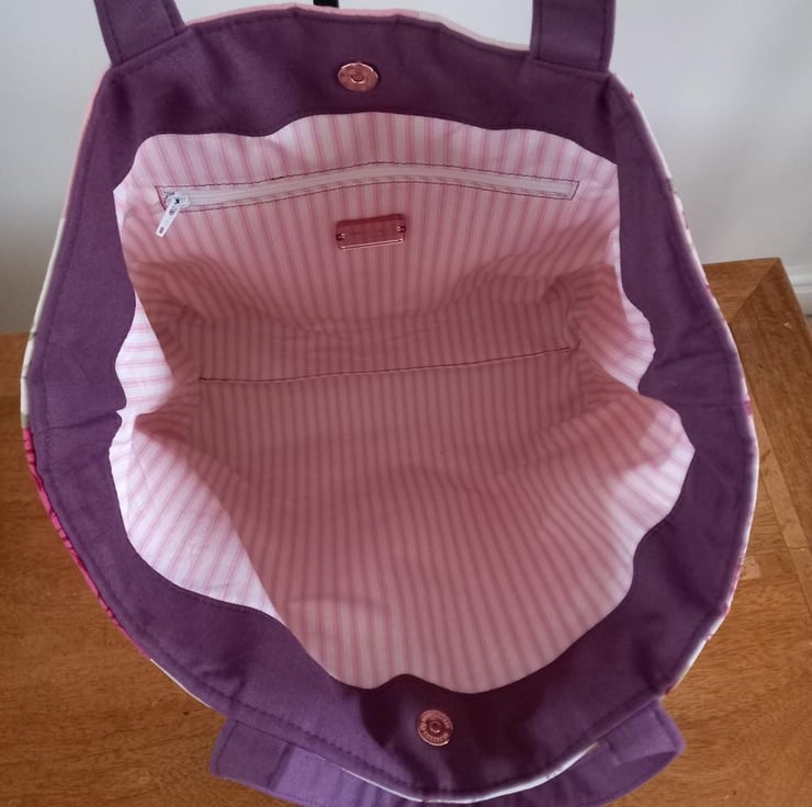 The base, handles and lining top are made from dark plum coloured linen and I've quilted the base and given it box corners to help the bag to stand up on its' own.