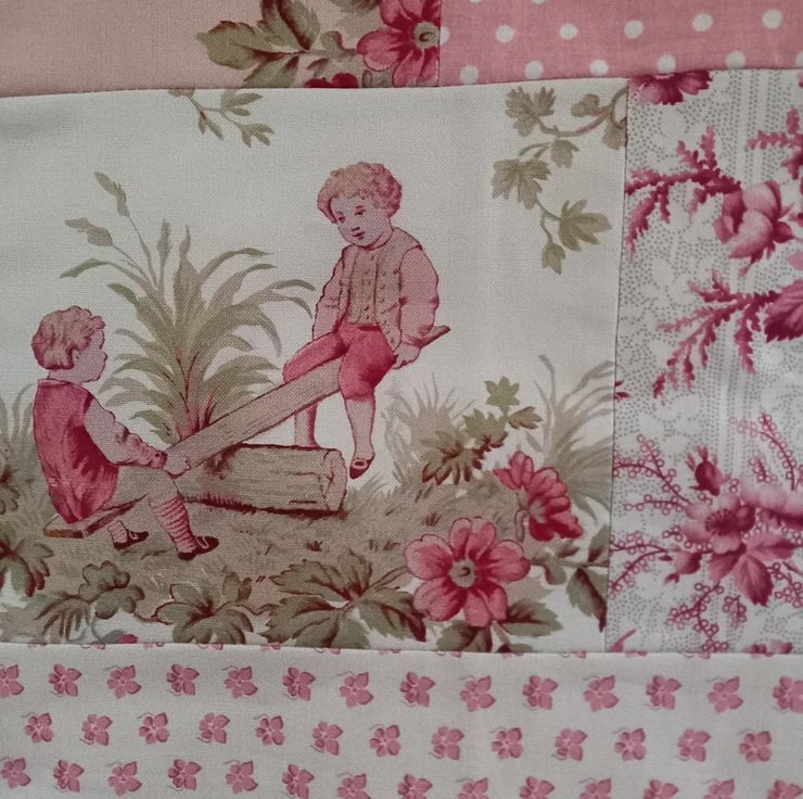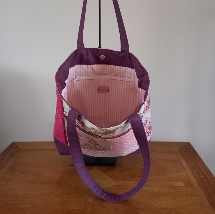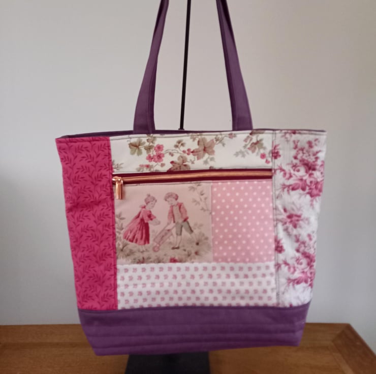 Unique handmade Pink Patchwork Tote bag with a patchwork design in shades of pink and cream, with beautifully illustrated Toile de Jouy inspired scenes of 18th century children at play. It is fully lined and has external and internal zipped pockets and the top fastens with a magnetic snap. The patchwork is 100% cotton and the bag is gently padded, giving it a lovely soft feel.