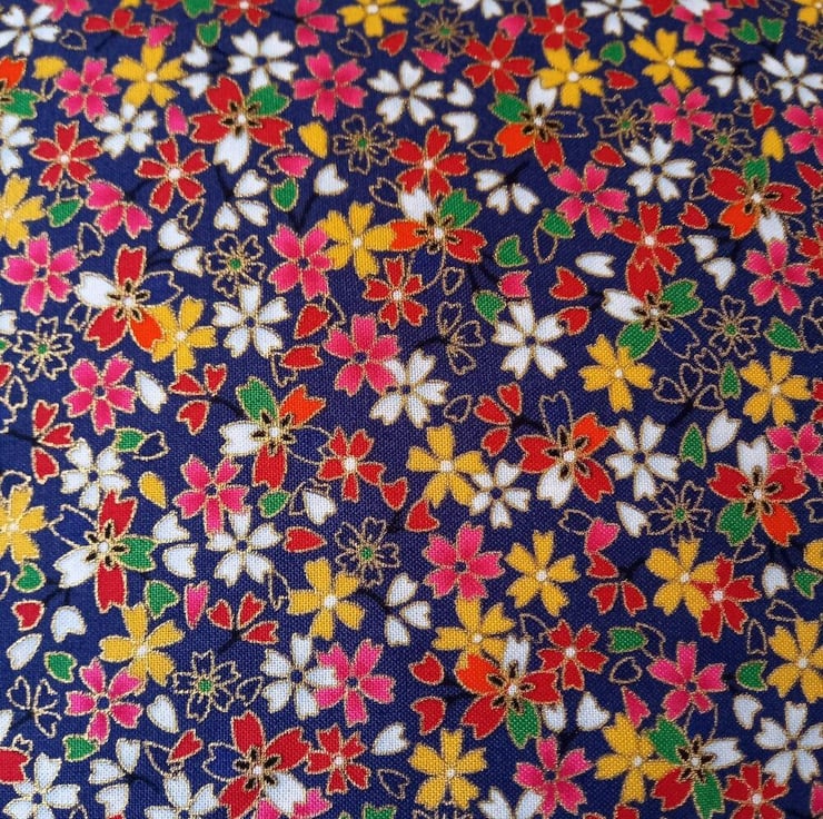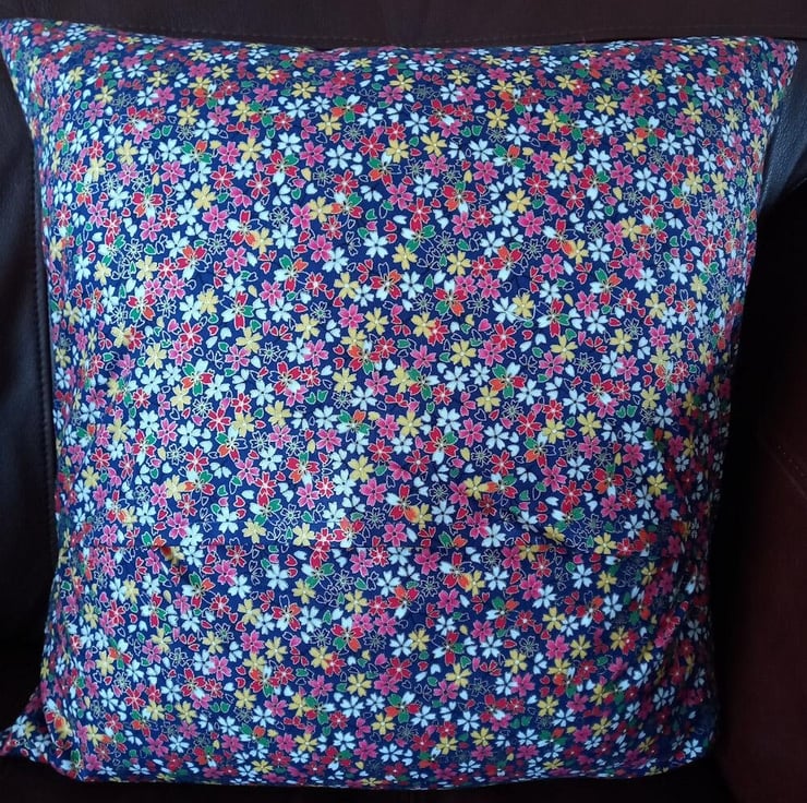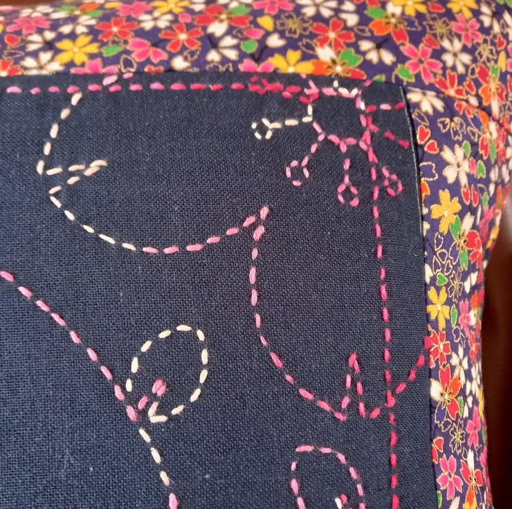 The pink embroidery thread is variegated, with tones ranging from white through to dark pink. I've framed the embroidered panel with a multicoloured Japanese floral fabric and have created an "envelope" style back opening to facilitate the insertion or removal of the cushion pad.