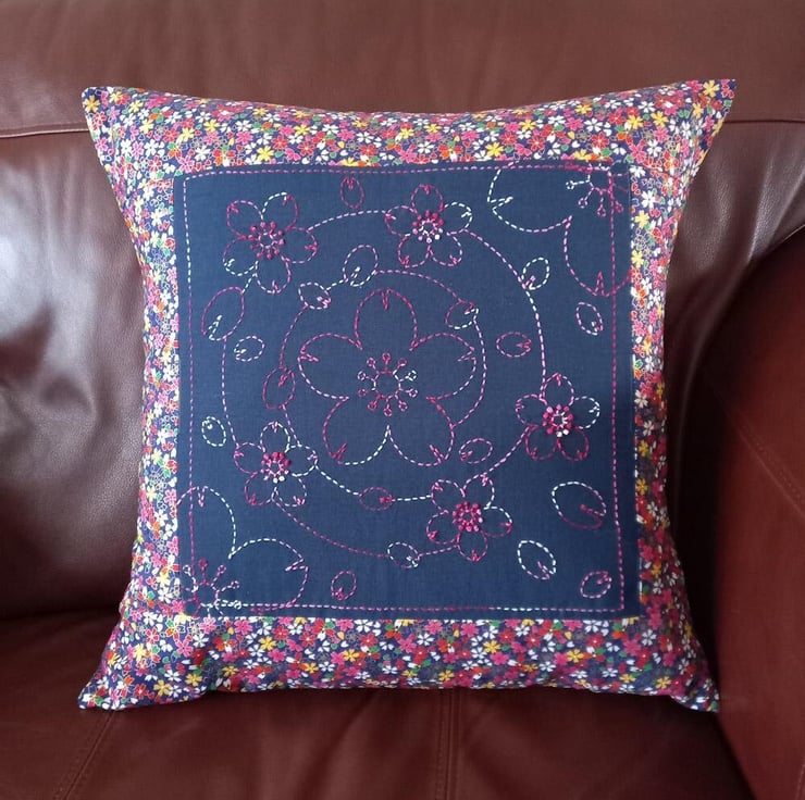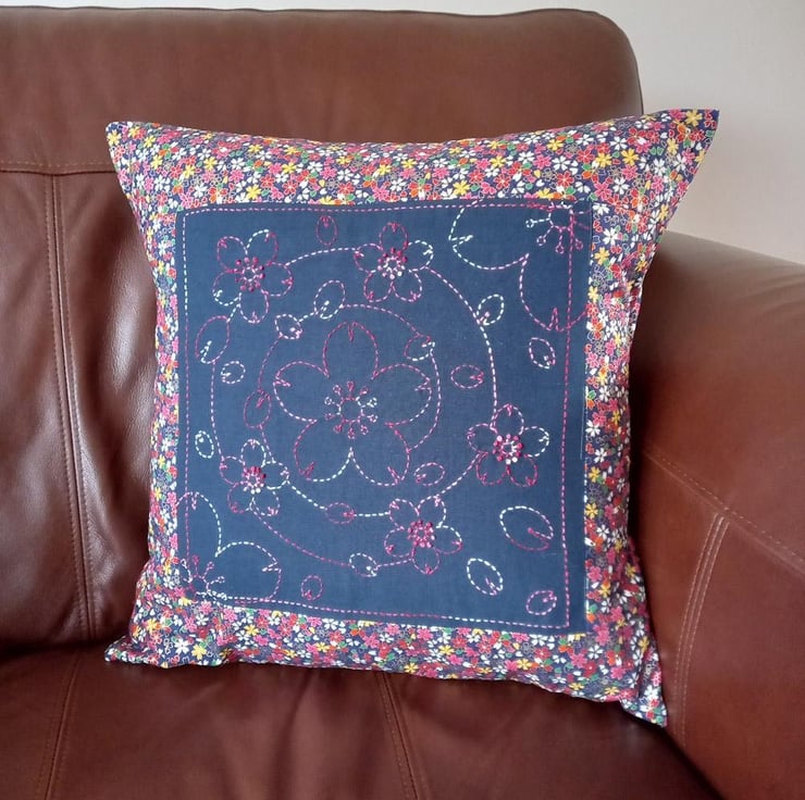 Sashiko Stitched handmade cushion with a pink Japanese blossoms design hand embroidered onto navy cotton fabric.