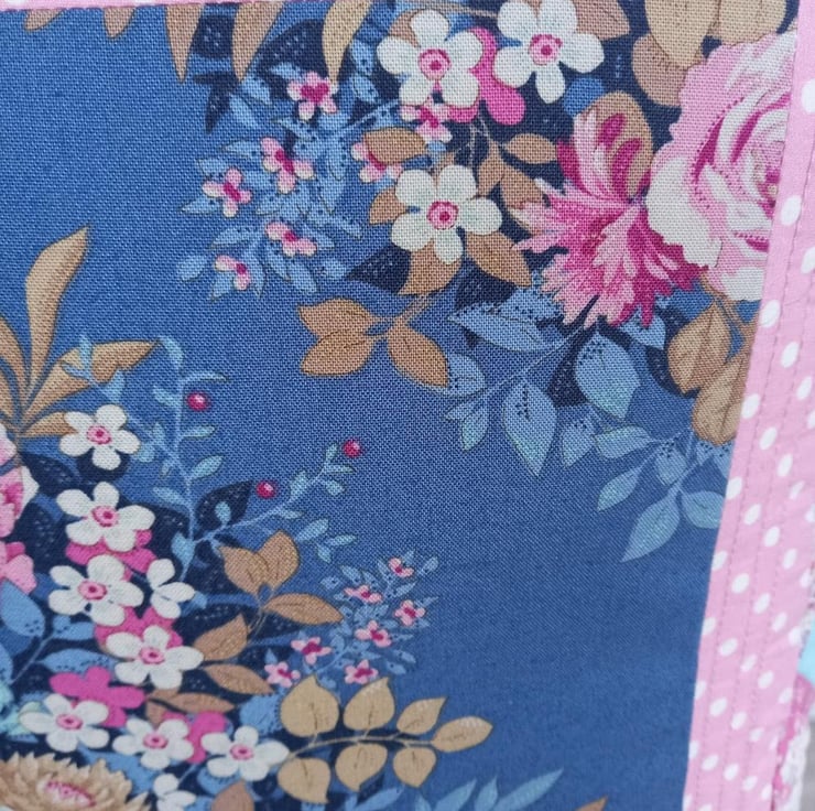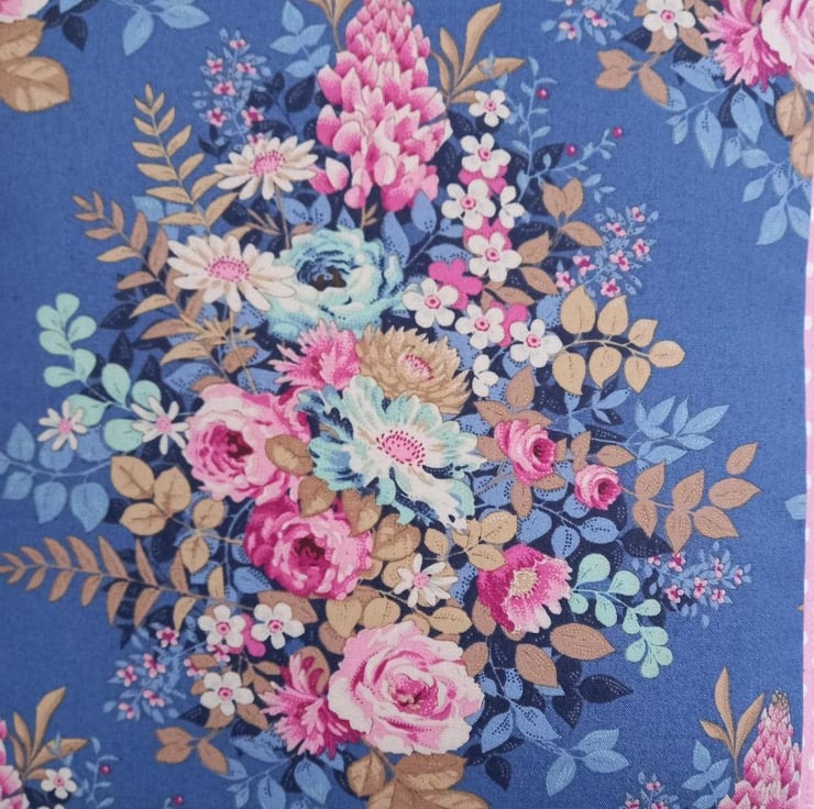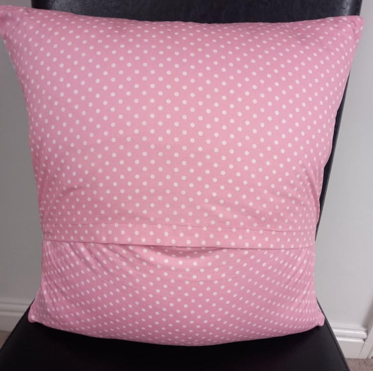 I've used a lovely selection of Tilda floral fabrics to create the decorative front panel of the cushion cover. A beautiful centrally placed floral bouquet print is surrounded by ten different complementary prints, which I've then quilted to provide texture and extra interest. The reverse side is soft pink cotton fabric with white dots and has an "envelope" opening to facilitate the insertion of a cushion pad.
