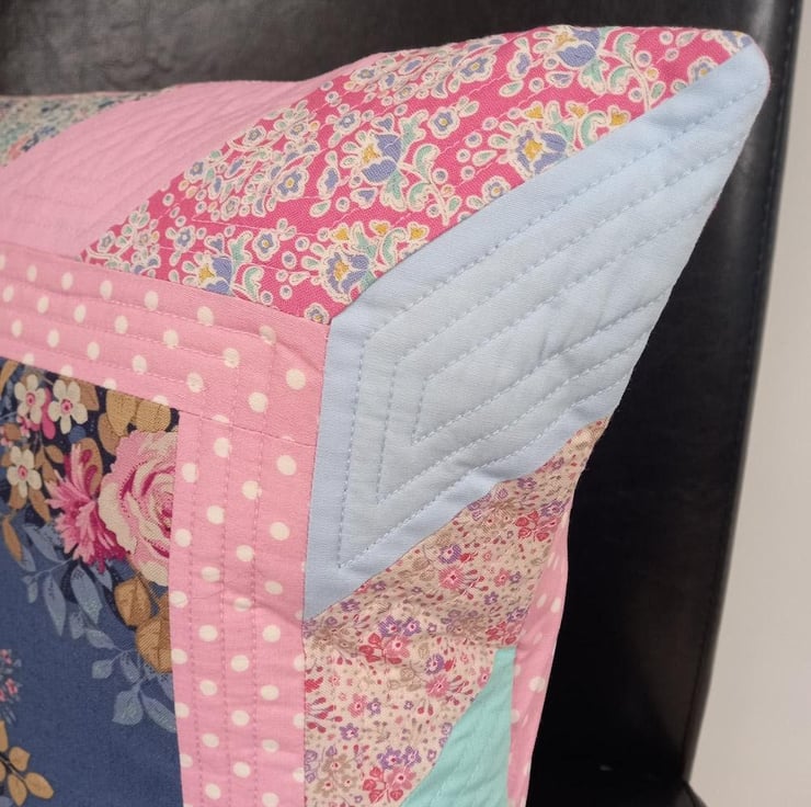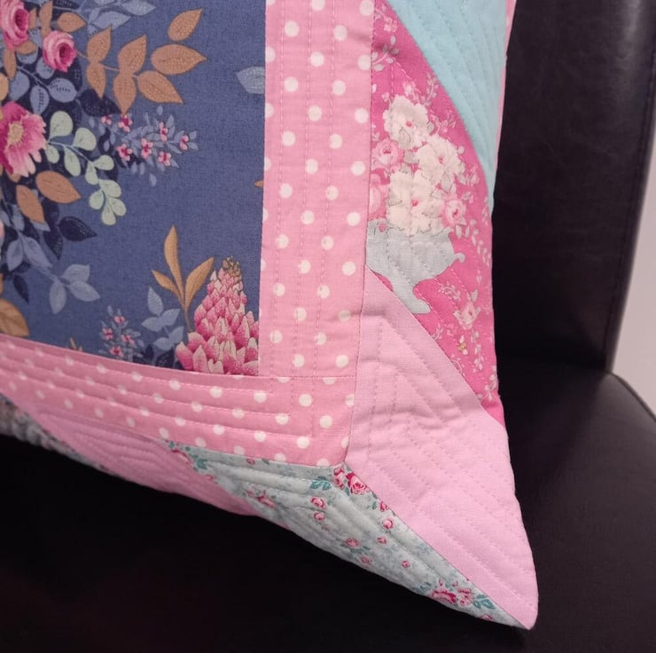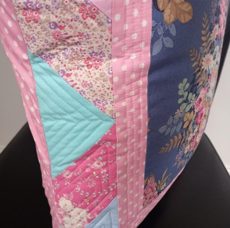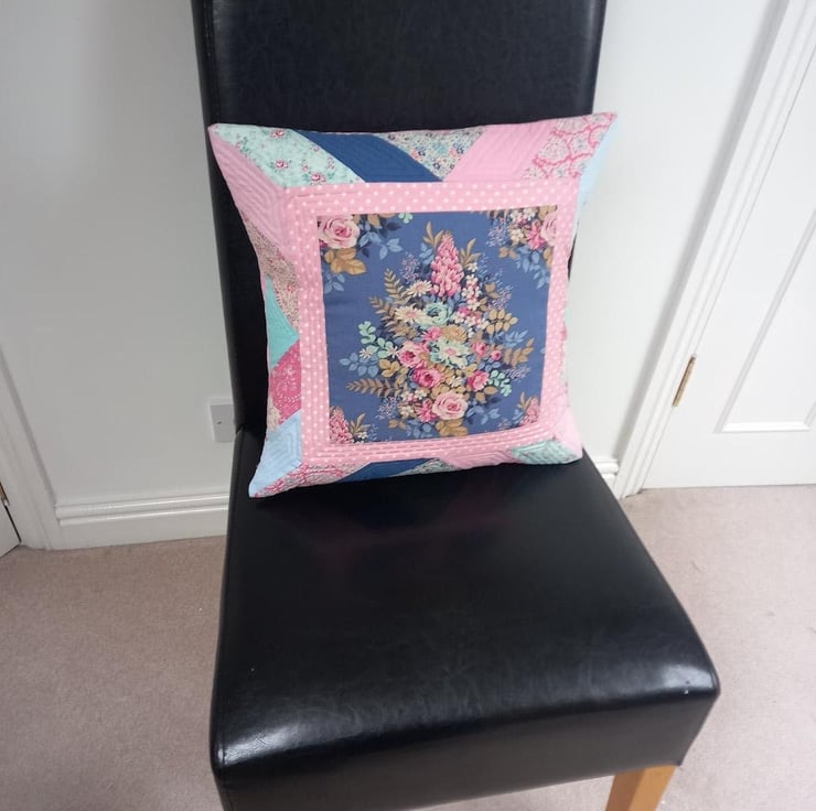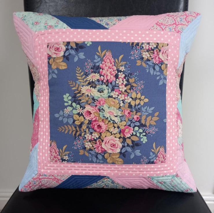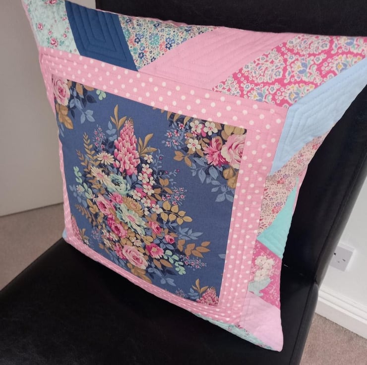 Quilted patchwork floral cushion featuring a central bouquet print in shades of pink and blue. The cushion cover is entirely handmade by myself.