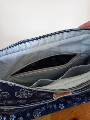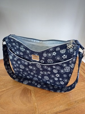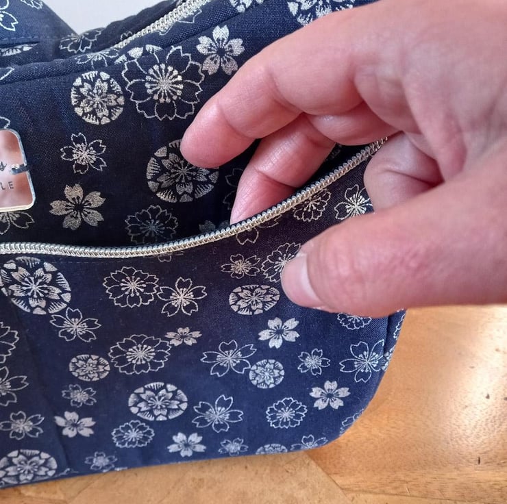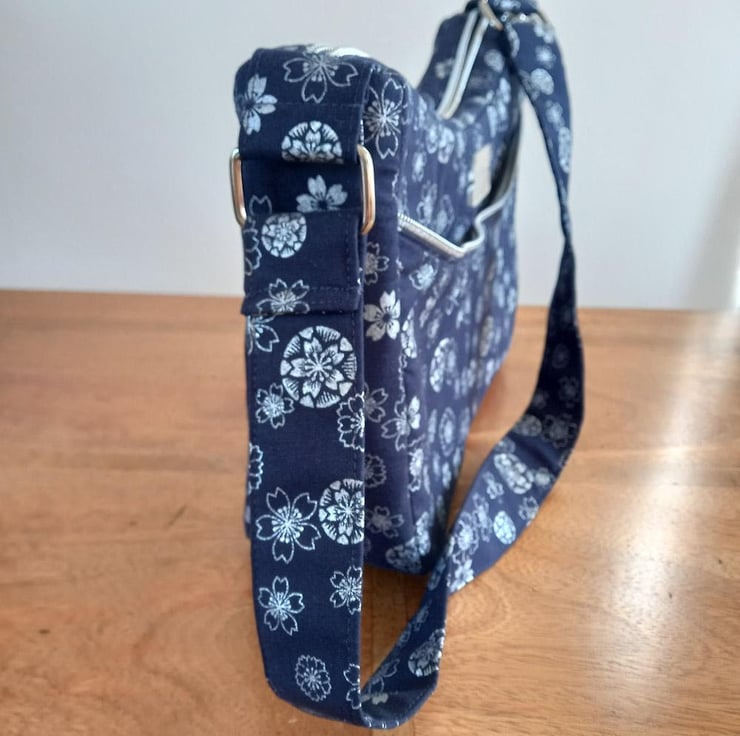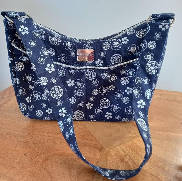 I've used a lovely silver metallic flower on a navy background fabric for the exterior of this bag and a co-ordinating pale grey fabric for the interior. All fabrics are 100% cotton. I've sewn in a layer of bag foam and medium weight interfacing to give the bag stability and shape.