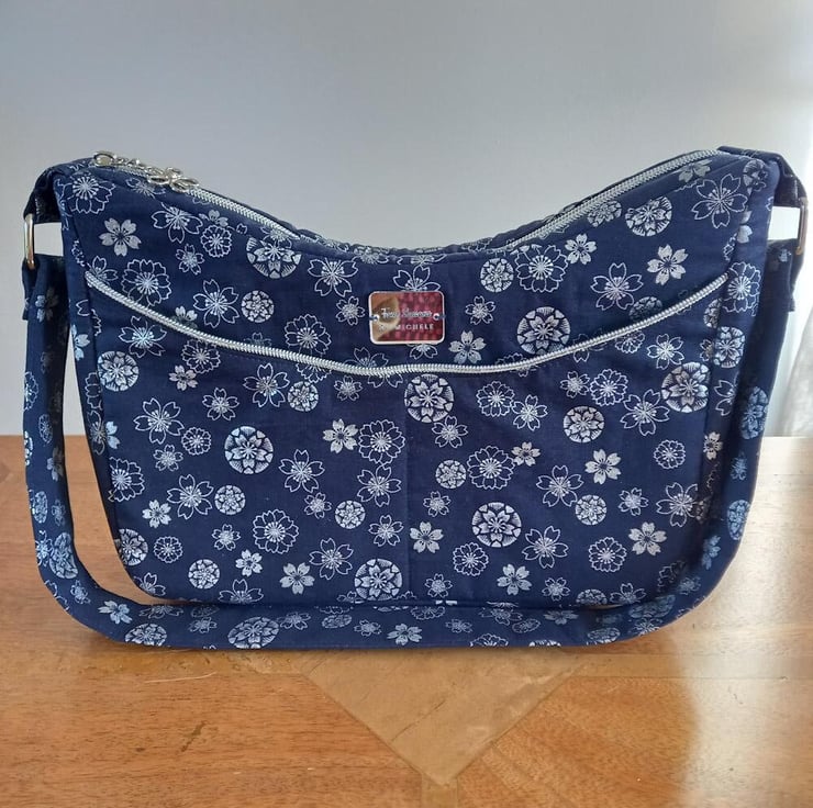 The top zip is silver coloured nylon with a metal zip pull and the strap is attached with matching silver coloured strap rings. There are double slip pockets on both outsides of the bag and these are edged with matching zip teeth for decorative effect. I've also added my signature Four Seasons By Michele badge on one side.