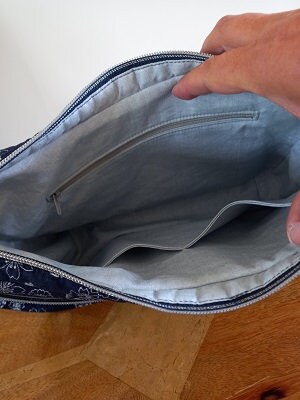 On opening the top zip you will see the lined interior, with a zipped pocket and two slip pockets.