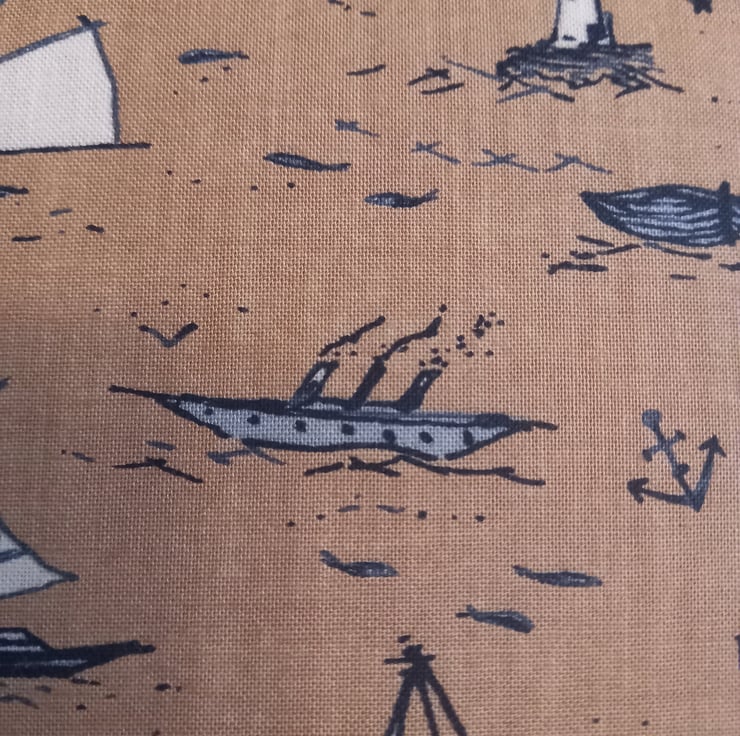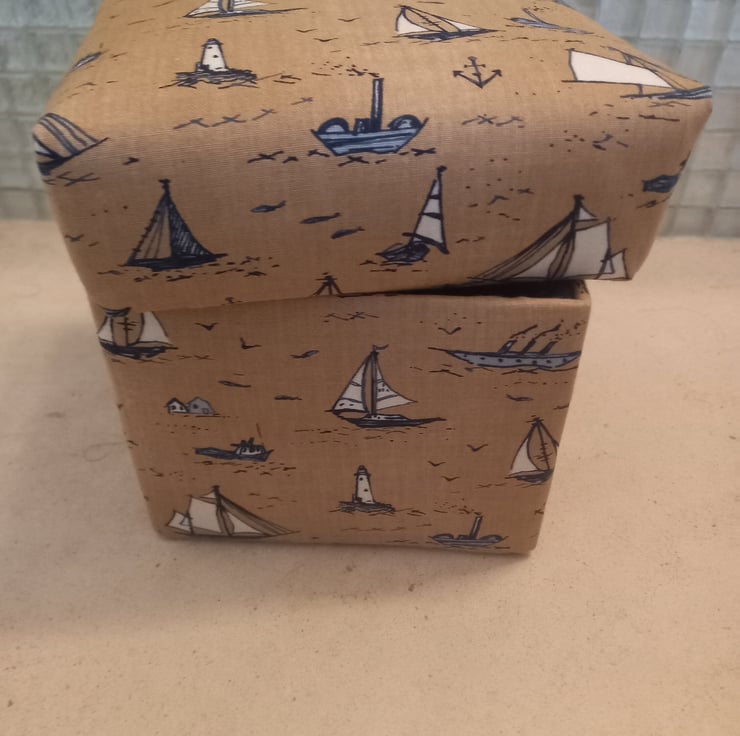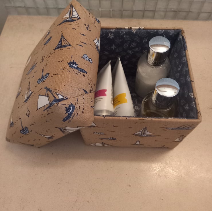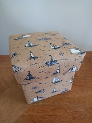 A Ships fabric covered handmade trinket box with a removable lid, padded and lined.