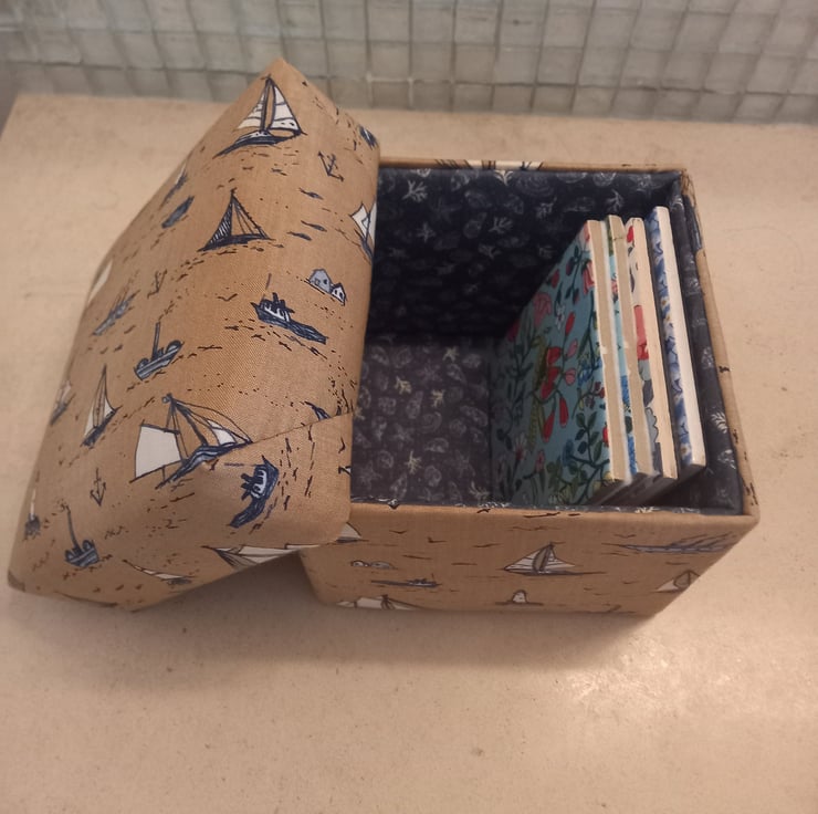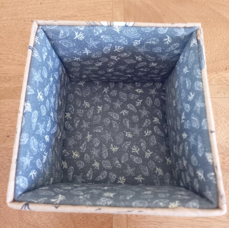 It would be a lovely gift in its own right or it could be used as a reusable gift container. I've covered the exterior of the box with a lovely boats printed fabric in navy and white on a beige background and the interior of the box is lined with a dark grey and cream fabric which has illustrations of sea shells and sea creatures. All fabrics are 100% cotton and all surfaces apart from the base are padded.