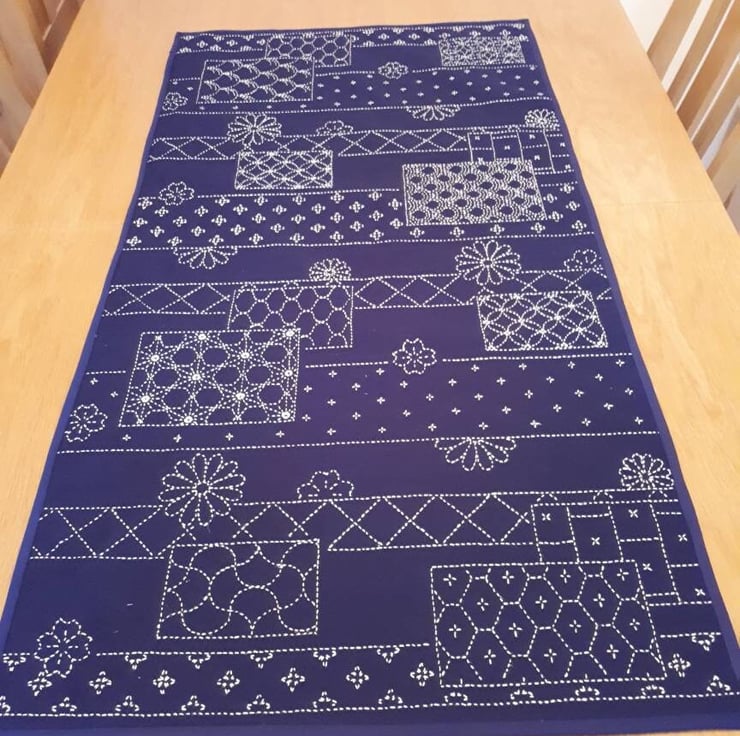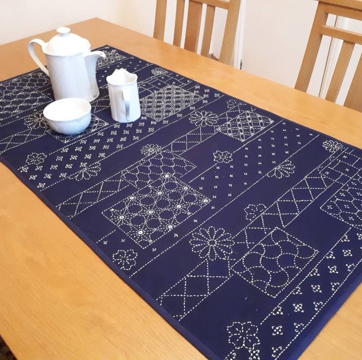 A stunning hand embroidered blue and cream table runner with a sashiko sampler design on a navy blue background.