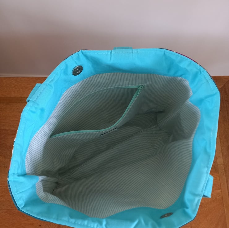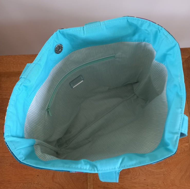 The bag base, handles and inside top of the bag are all made with turquoise coloured linen and I've also quilted the base pieces and edge topstitched the handles. The bag has box corners which enable it to stand up on its' own.