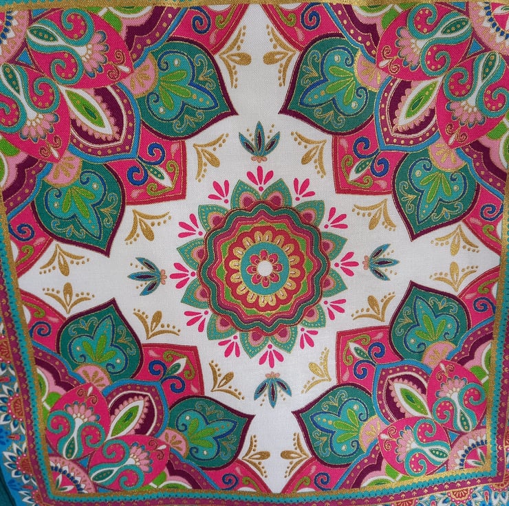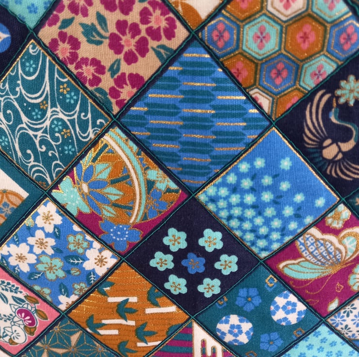 I've constructed this bag using a lovely mandala print panel from Makower's Jaipur fabric range for the front side. I've framed this with Jade green side panels that I have quilted with wavy lines. For the reverse of this bag I've used a diamond patterned oriental design fabric and have quilted it, giving the bag a wonderful padded texture.