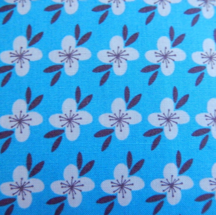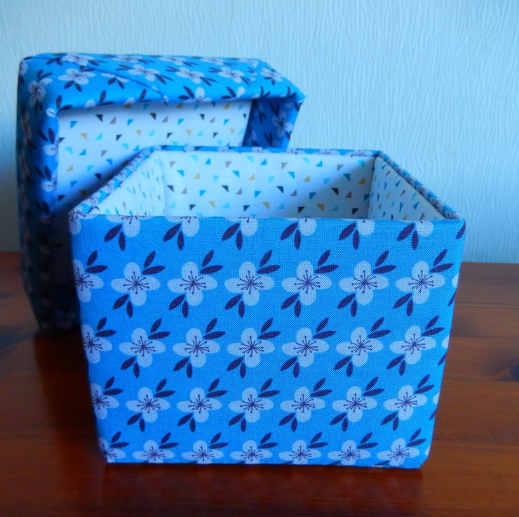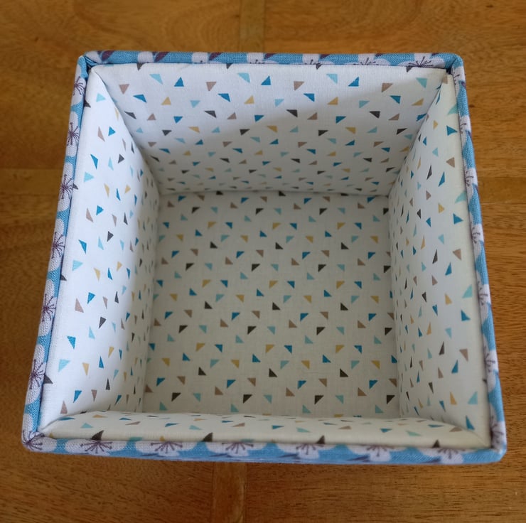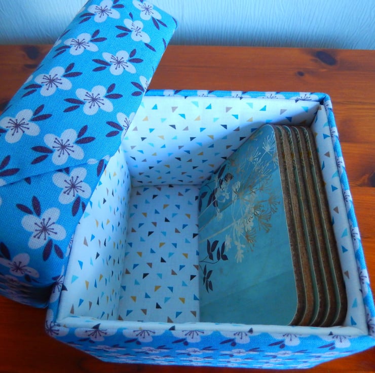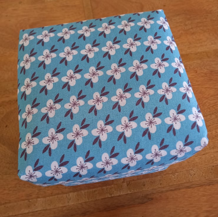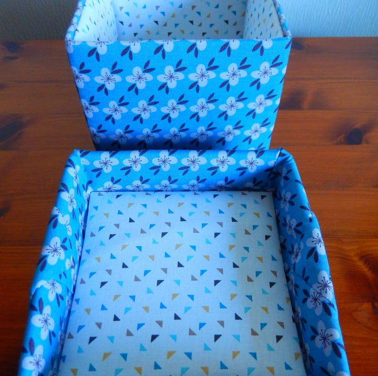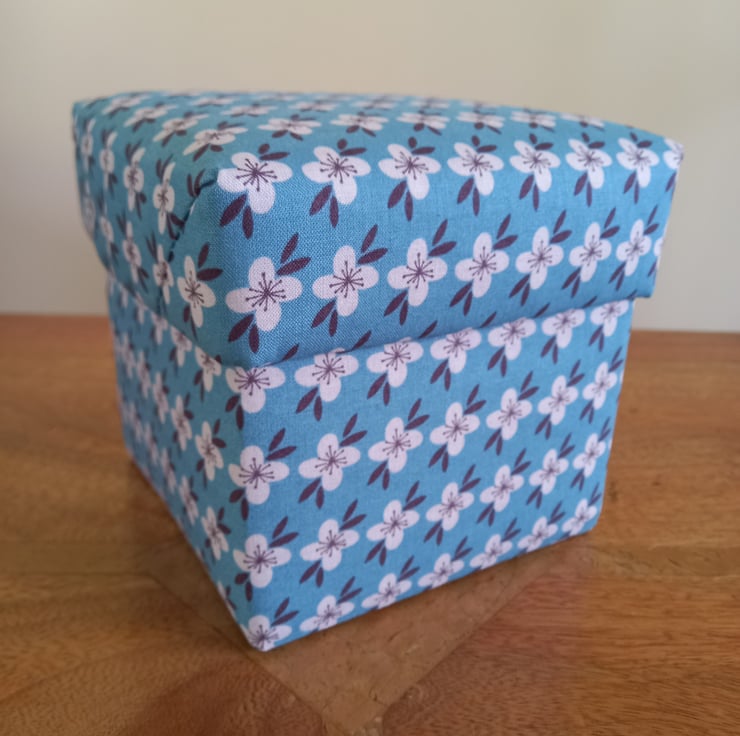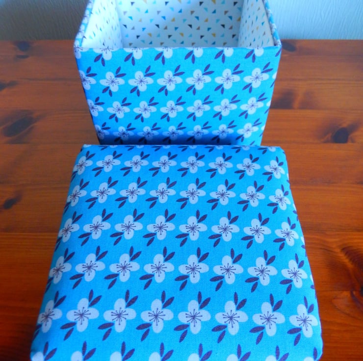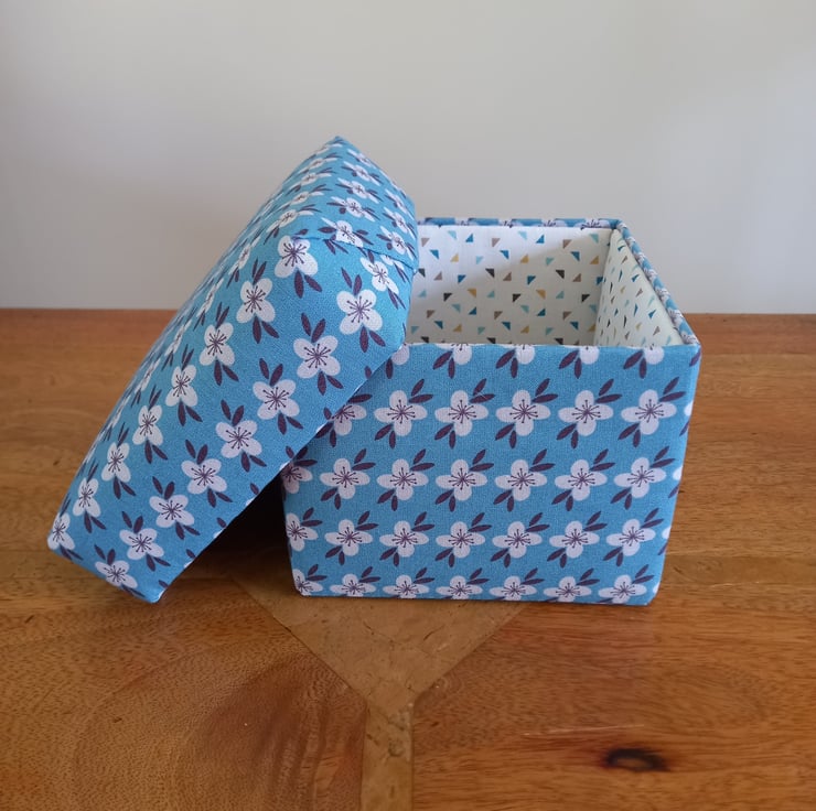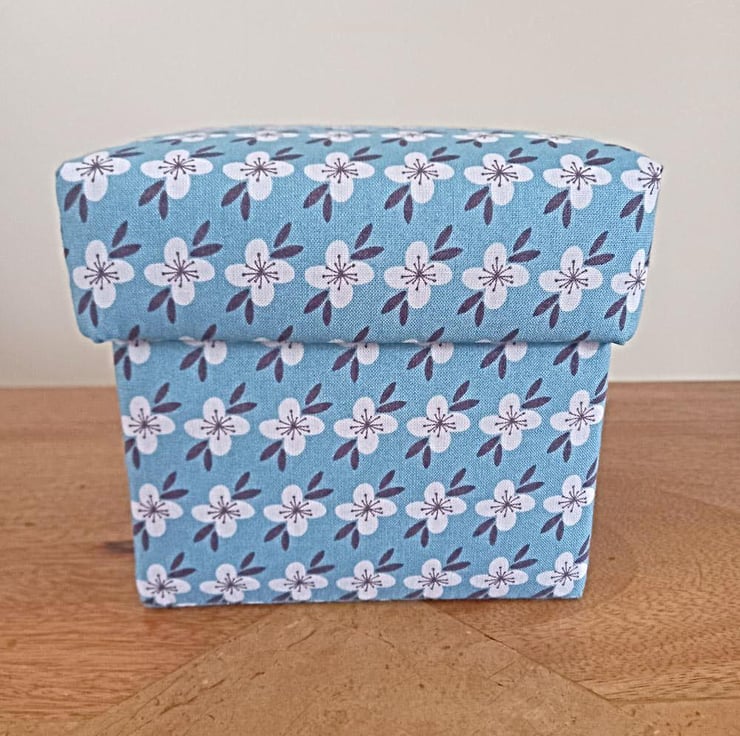 A modern fabric covered decorative trinket box in shades of blue and cream. It has a removable lid and is padded and lined. All fabrics are 100% cotton and all surfaces apart from the base are padded.