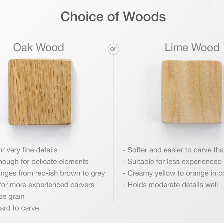 Oak wood is suitable for all woodcarvers but is significantly harder and more dense than Lime. Oak is perfect for highly detailed carvings.