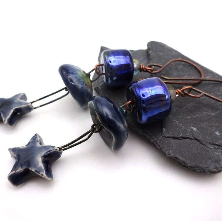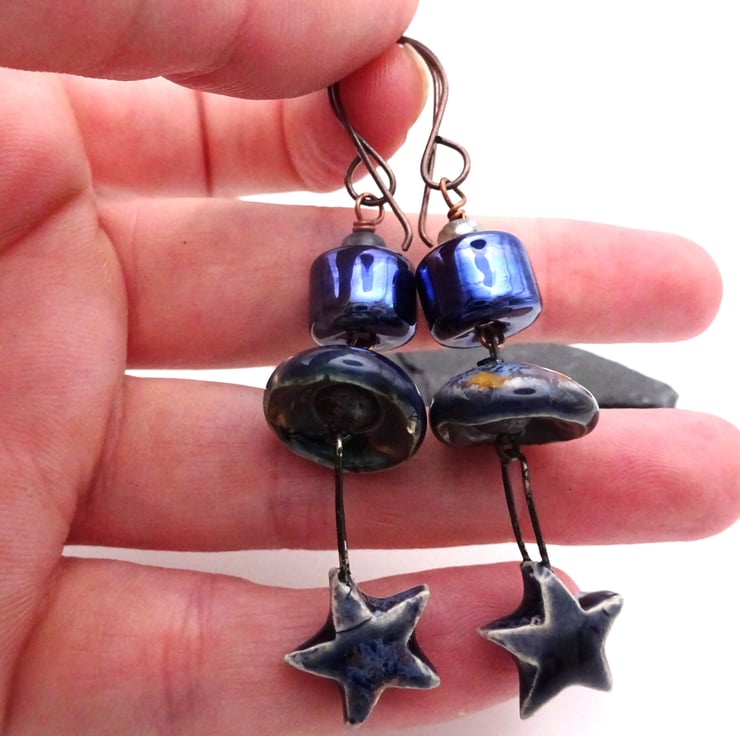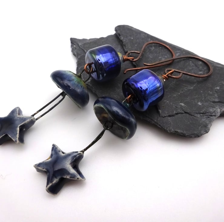 A pair of earrings made with handmade copper ear wires, handmade lampwork blue/silver glass beads and handmade ceramic star drops.