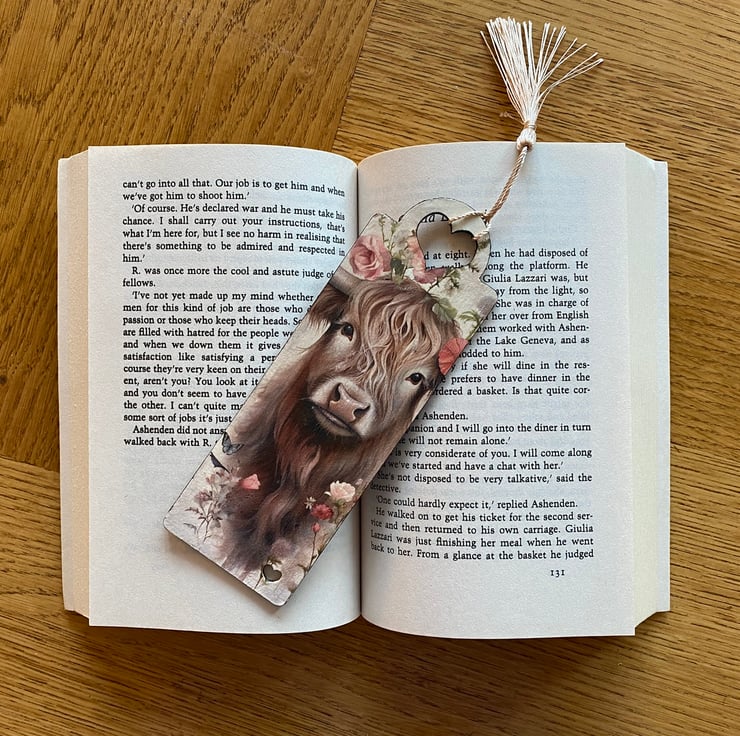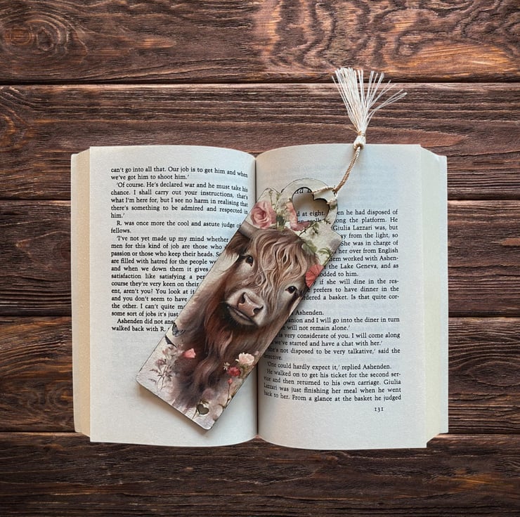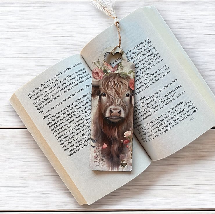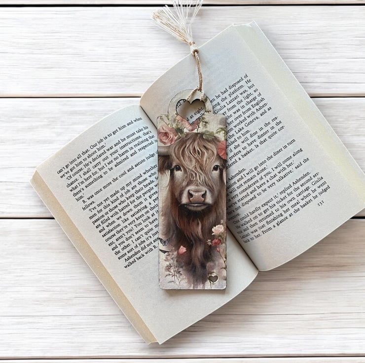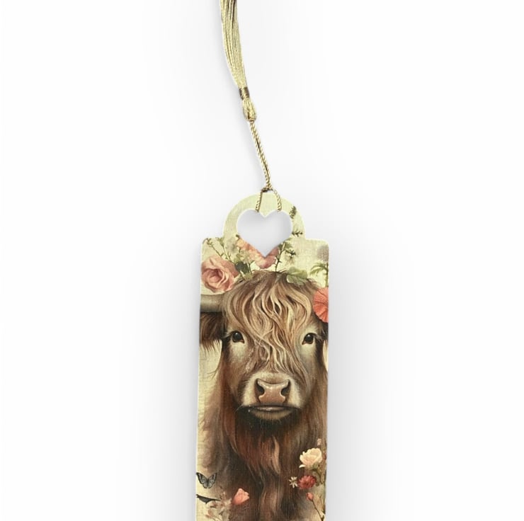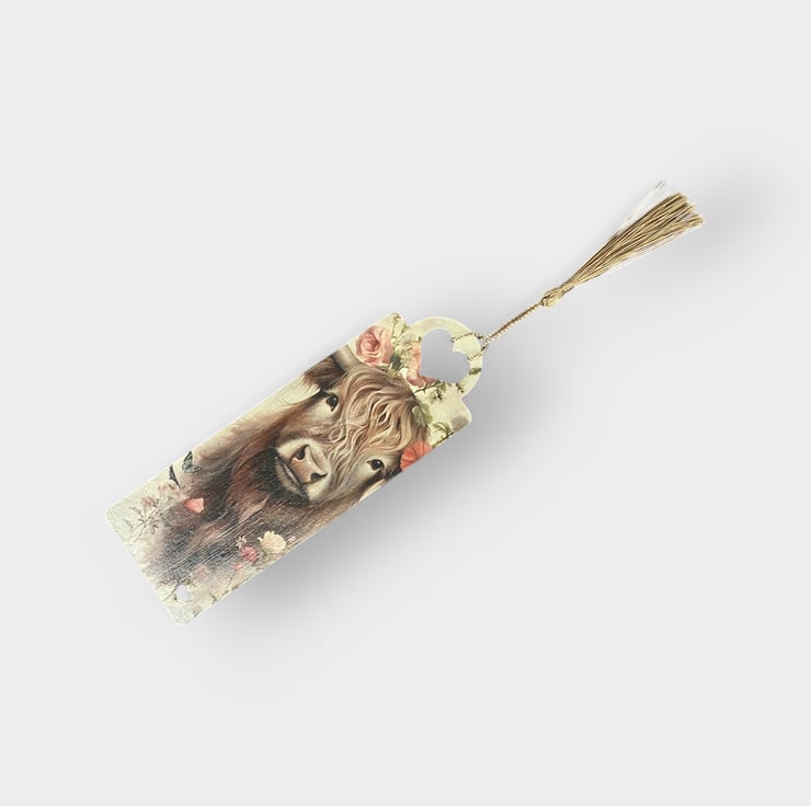 Wooden decoupage bookmark, featuring a highland cow. Made from 2mm MDF, these bookmarks are lightweight, durable, and perfect for book lovers. Each one is carefully decorated using the decoupage technique. Approxmately 17.5 x 6cm x 2mm.