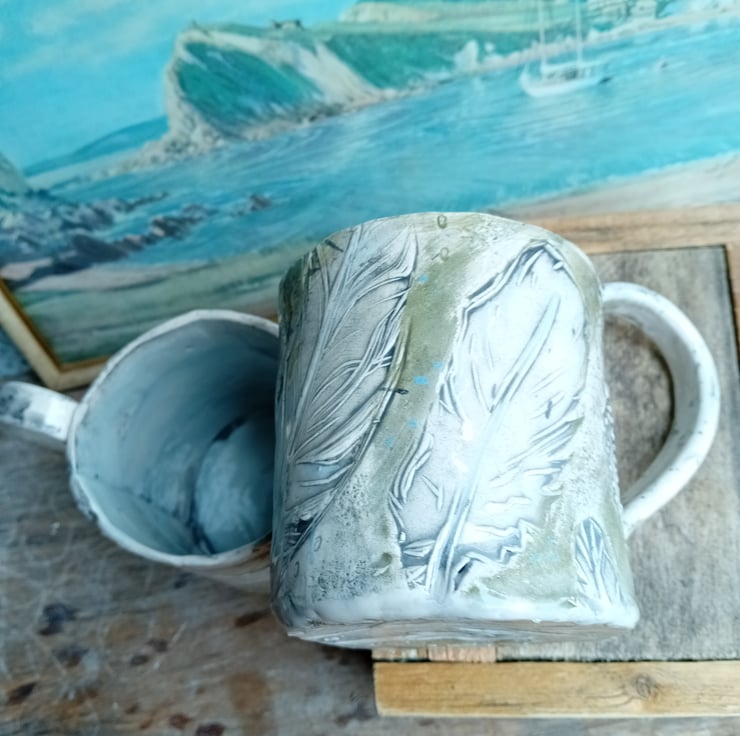 Feather coffee mug, in olive and grey, handpainted colours varies each time, earthenware clay, handbuilt and low fired to save energy, feather designs are made with my hand carved linocuts.