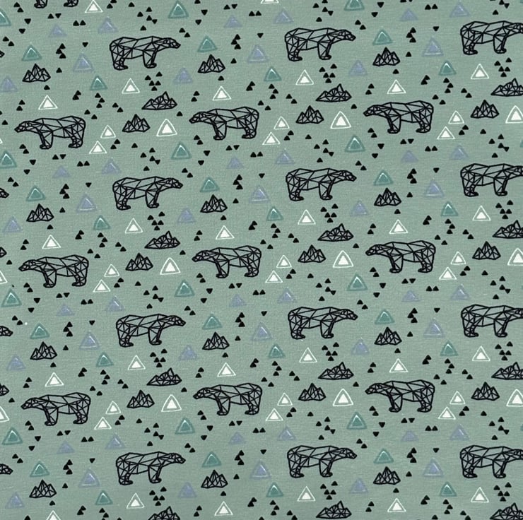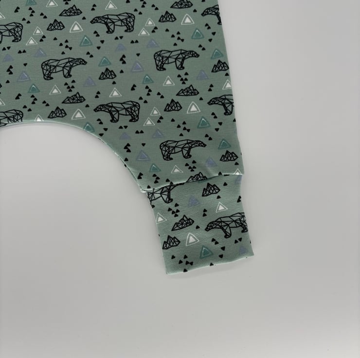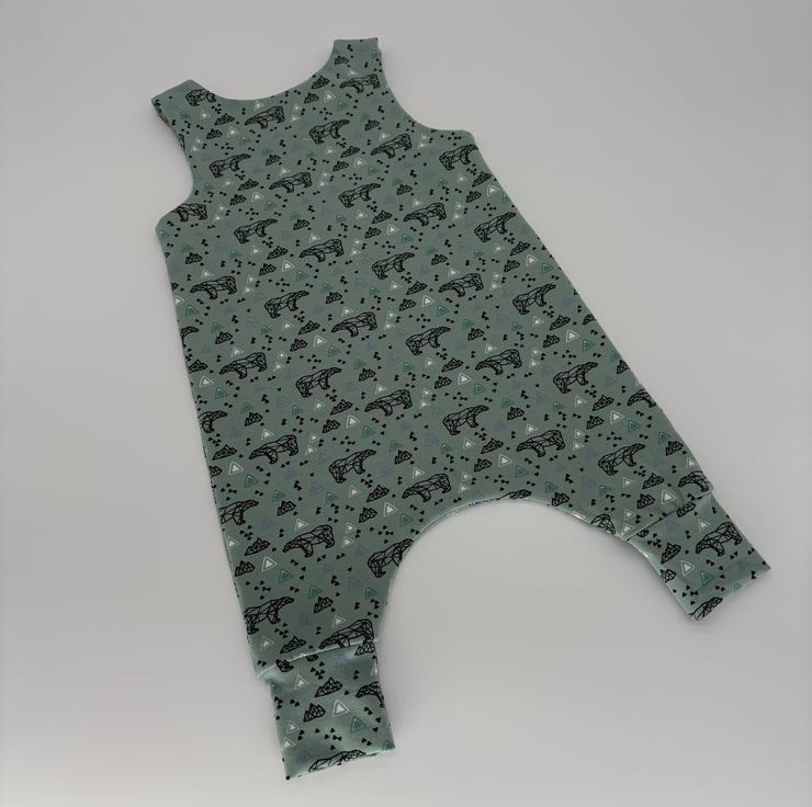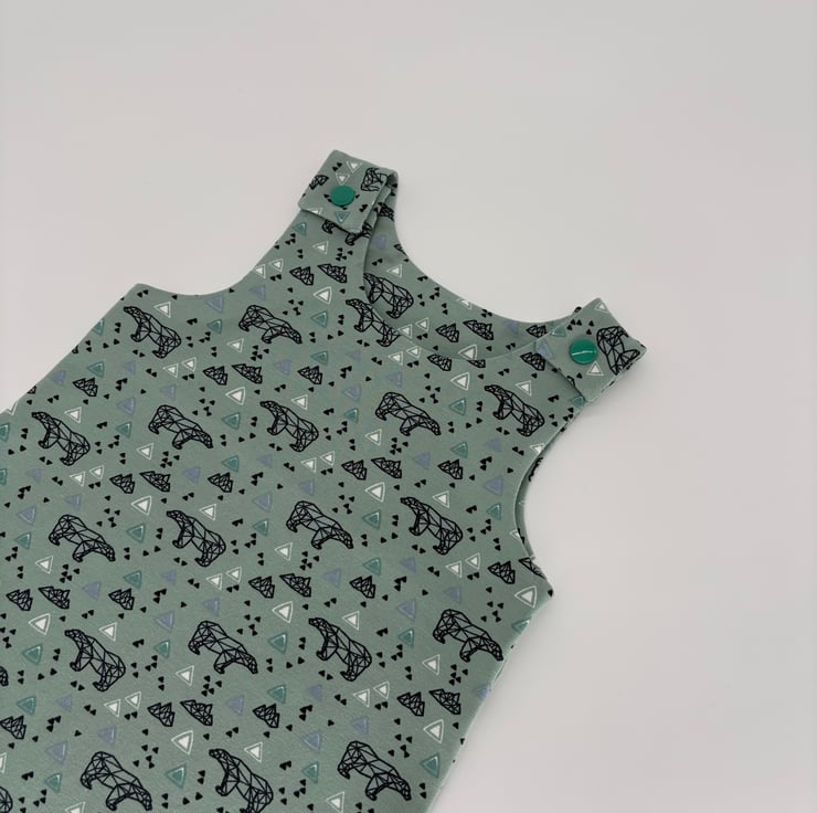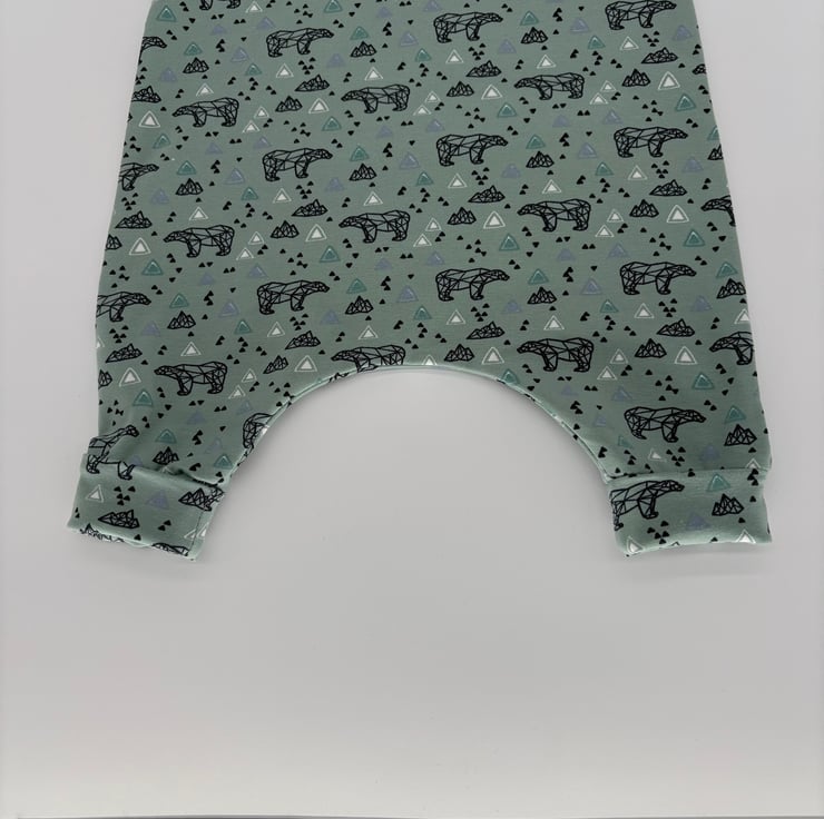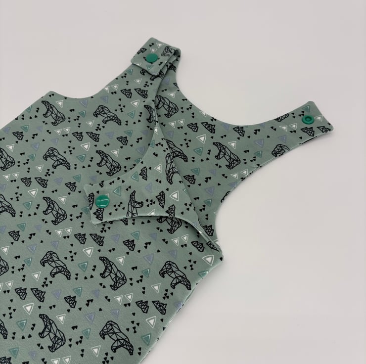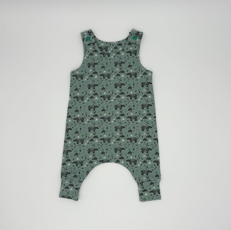 Handmade dungarees with a geometric bear print on a green background with matching cuffs. In various sizes.