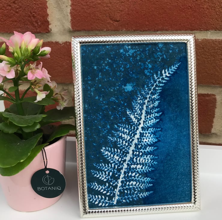 Original Botanical Art - Framed art. Sitting pretty in a contemporary silver-plated frame with detailing to the front. This shapely Fern Frond in shades of blue and white, shoots across a speckely blue sky like a shooting star.