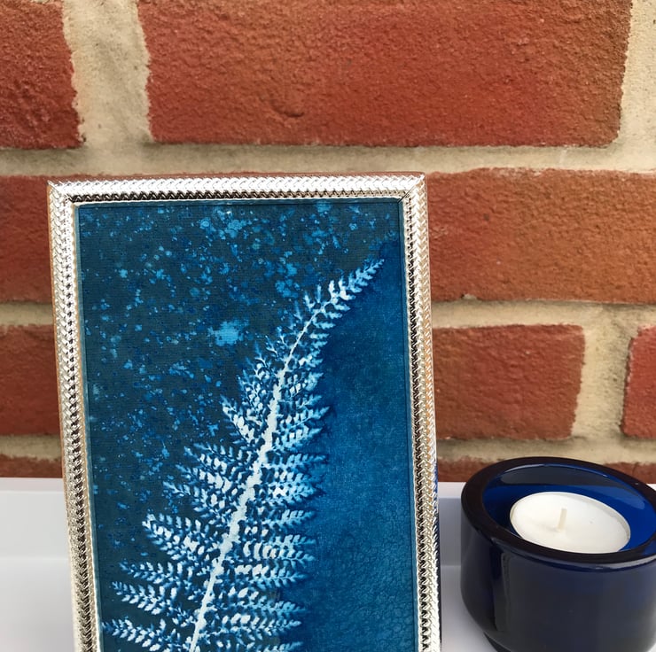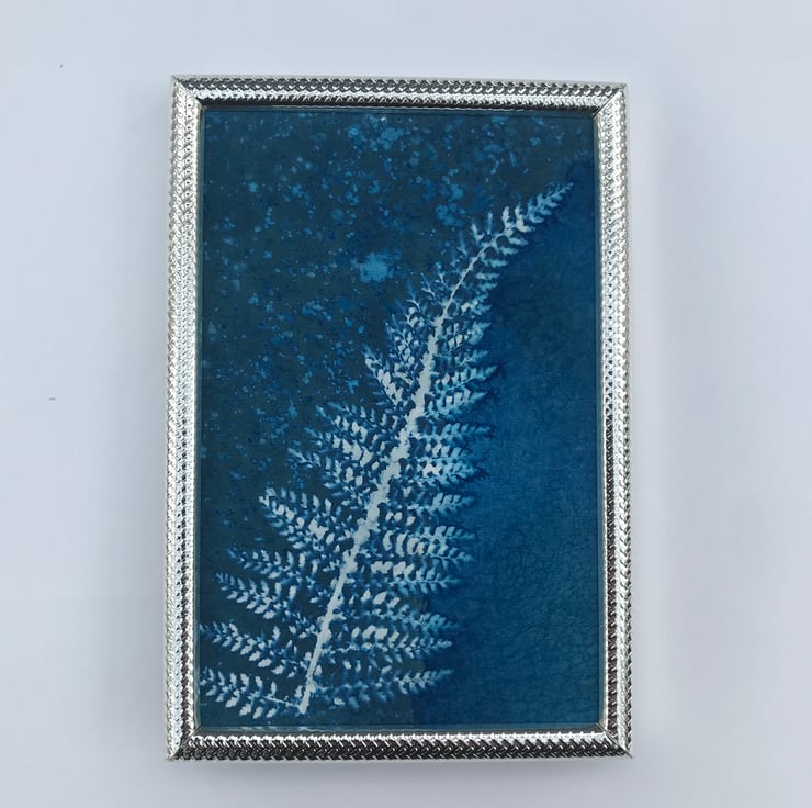 I loved working with the hand made paper for this one, it is so soft and delicate. The Cyanotype solution soaks well into the paper and gives a deep blue finish to the print. I picked this baby fern from my garden in the spring when they are newly emerging, and pressed it ready to use later in the year.