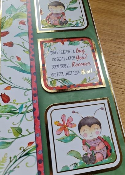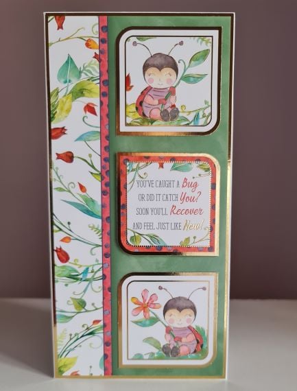 The card is made with a green floral design with gold foil trim. The topper features 2 ladybirds and the sentiment reads, 'You've caught a bug or did it catch you? Soon you'll recover and feel brand new!'.
