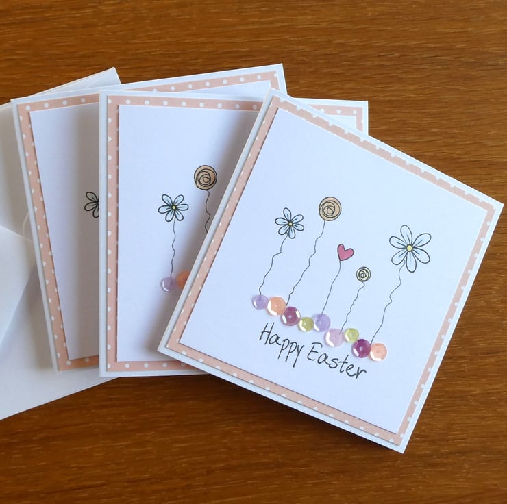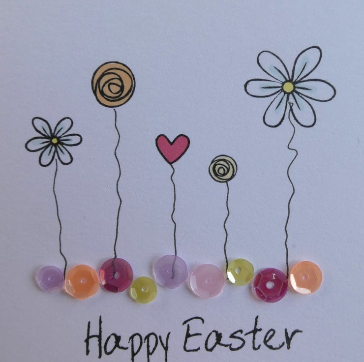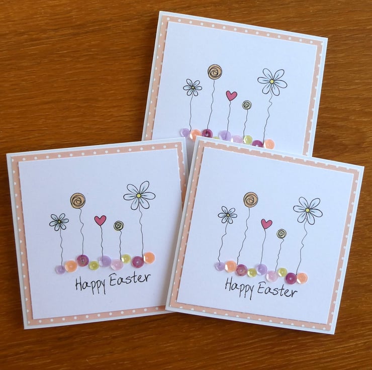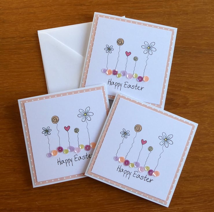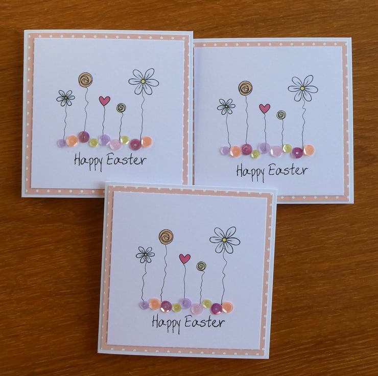 This set of 3 mini Easter cards have a row of flowers and a heart in pastel colours, sitting above a line of pastel sequins and the greeting Happy Easter.