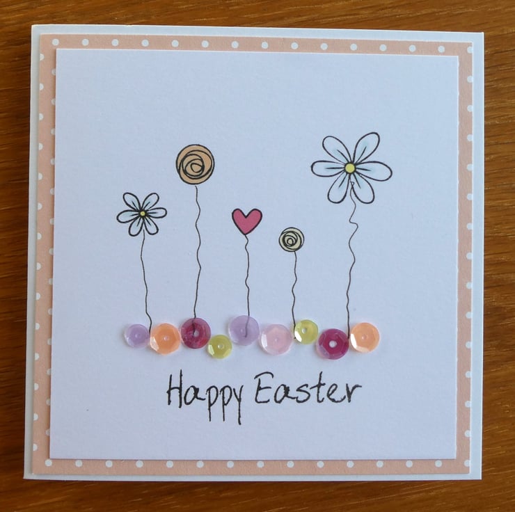 The message Happy Easter has been stamped in black archival ink at the bottom and the completed design has then been mounted onto peach and white polka dot card to frame it before being added to a white card measuring approx 10cm square.