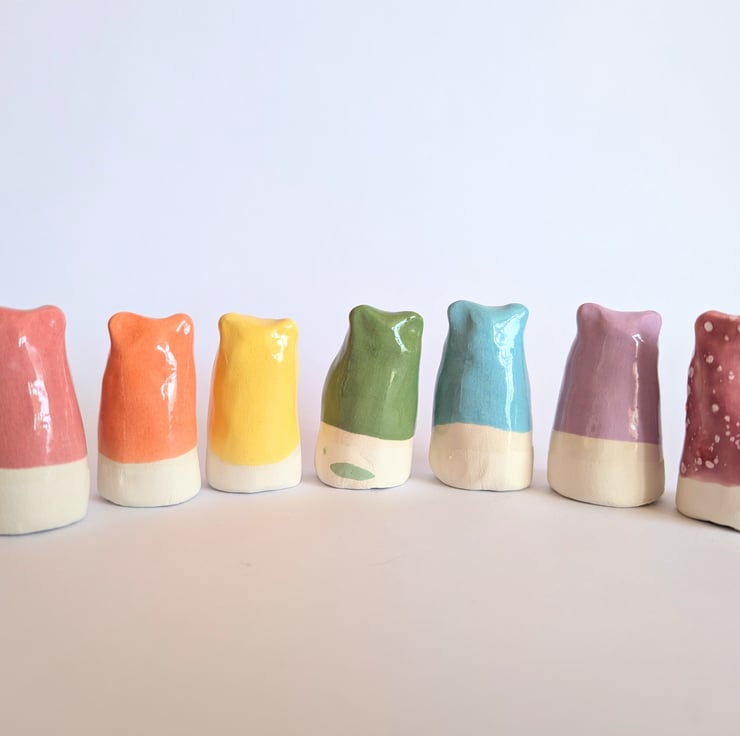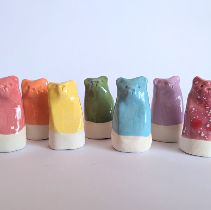 These little bear figures were a fun way to test fire my new underglazes, I sculpted the bears out of some left over clay and painted each one with a different colour, they've sat on my work bench for a couple of years to show me how the colours fire but now I think its time they had some new homes.