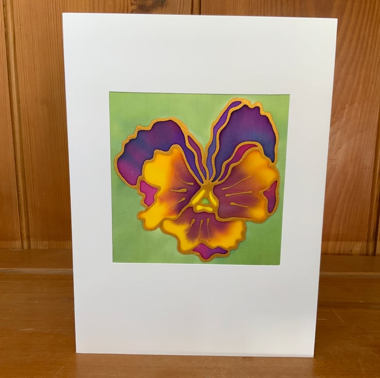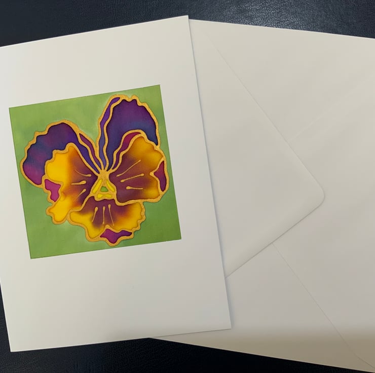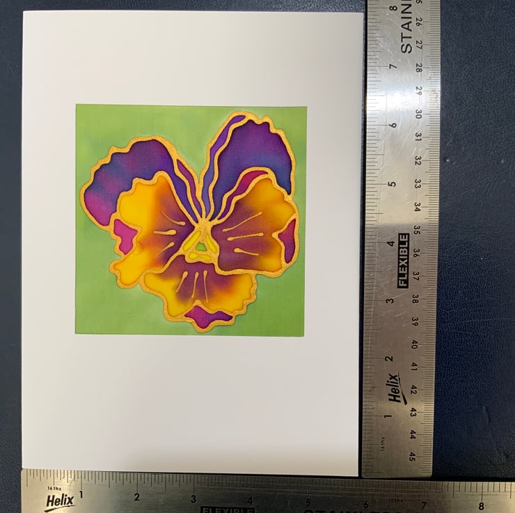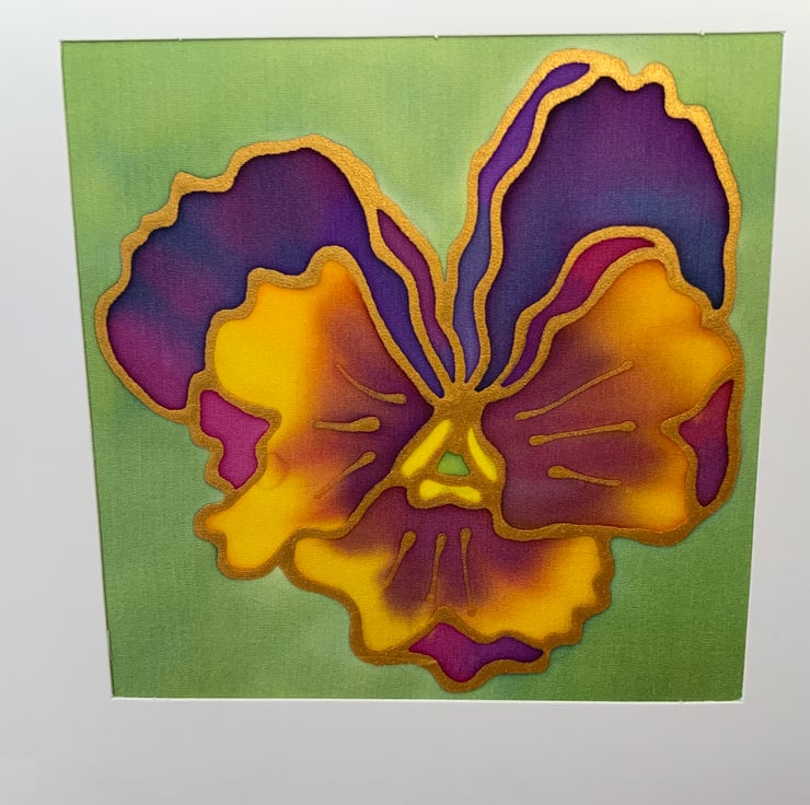 The silk painting itself is 3.75” x 3.75” inches. It’s outlined in metallic gutta and features a detailed painting of a cute and colourful Pansy flower.