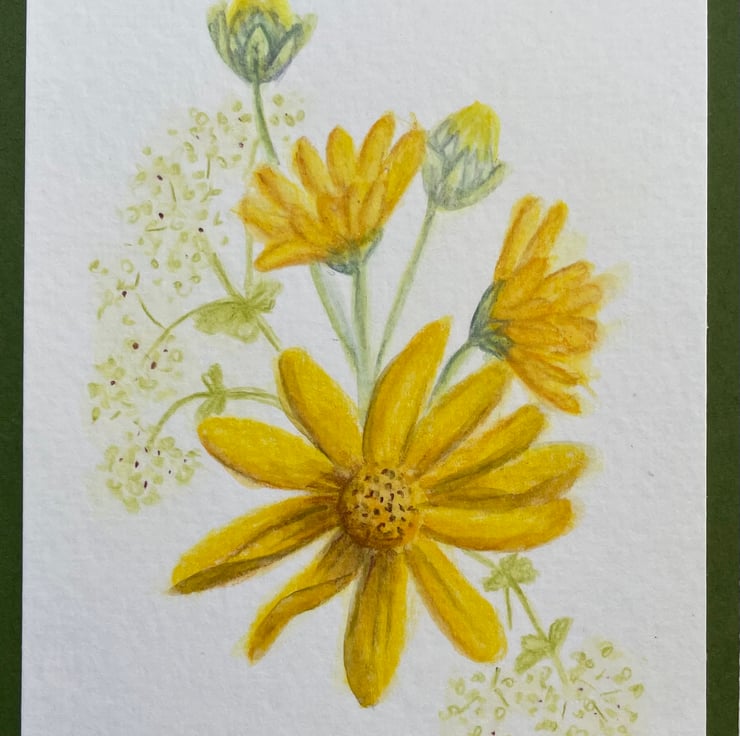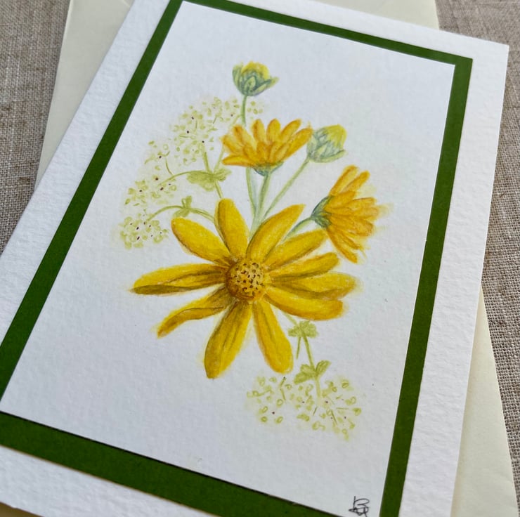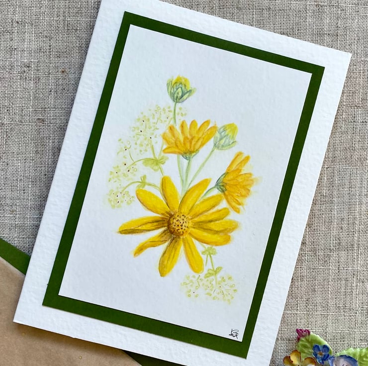 This blank greeting card features some pretty hand painted yellow daisy and alchemilla flowers, painted in watercolour and mounted onto a complementary olive green background border, it is left blank for any occasion and would make a lovely card for a spring birthday, Mother's Day, or just sending a pretty note to a friend.