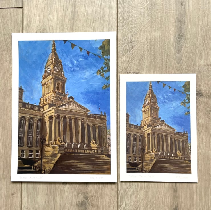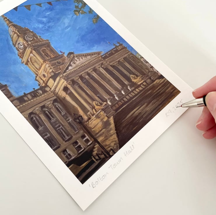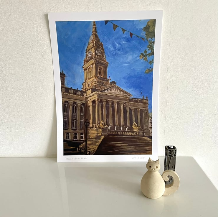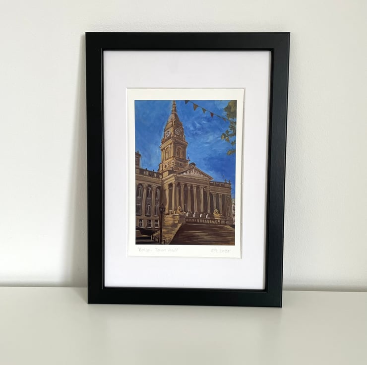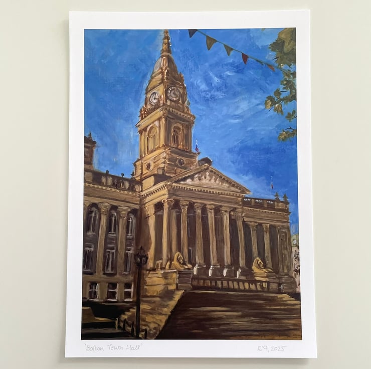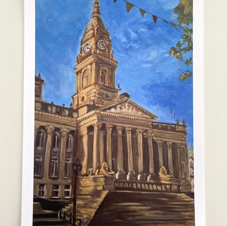 This high quality print is a reproduction of my original acrylic painting of Bolton Town Hall located in Lancashire, England.