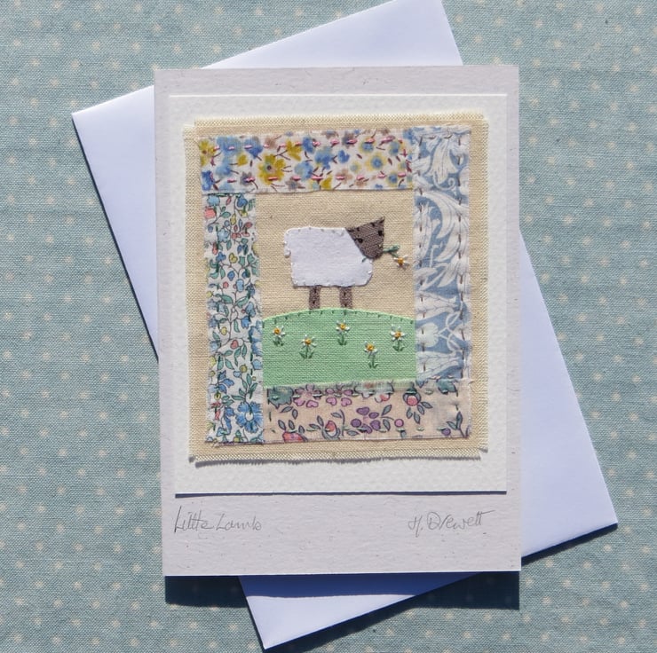 My cards measure 12 x 9 cm (3.5” x 5”) and come with toning recycled paper envelopes in a clear sleeve - no plastic! Each card is signed on the front and my studio stamp is on the back. The title is also written on the card, in this case 'Little Lamb'. Cards are made from stout 100% recycled card - blank inside.
