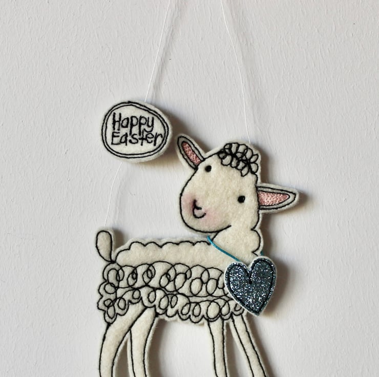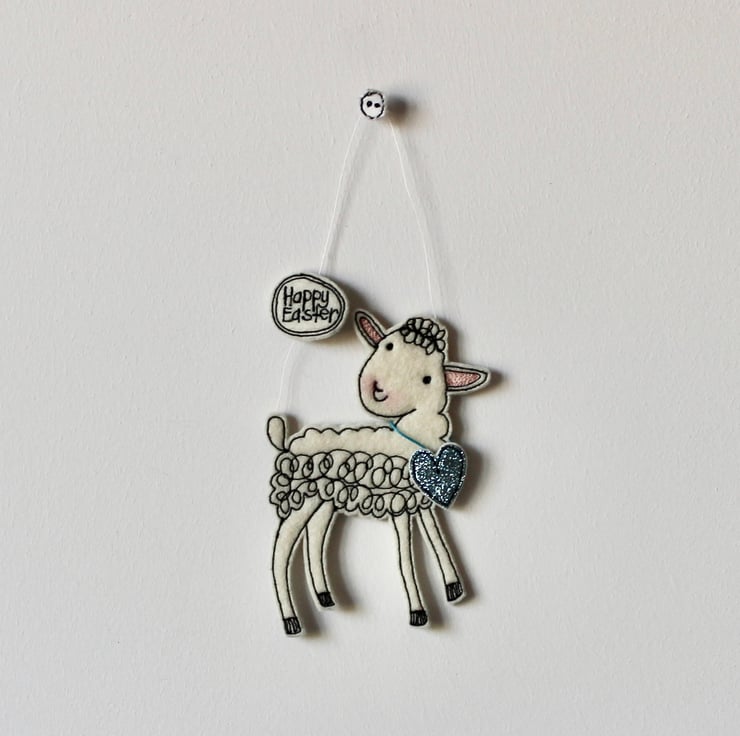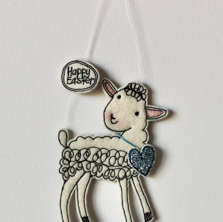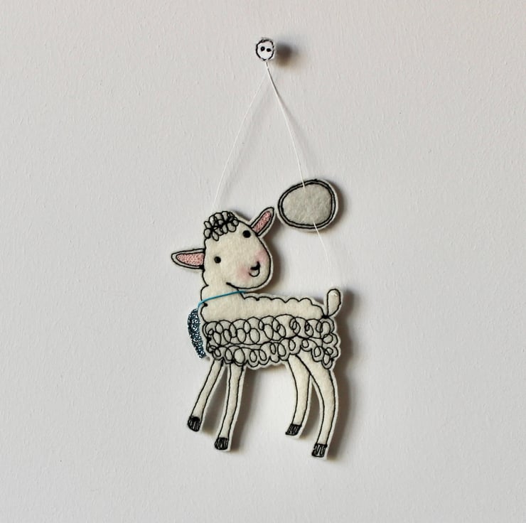 A delightful hanging decoration which is created using multiple layers of 100% wool felt, glitter fabric and free hand machine embroidery. Lambs are cut out by hand using a very sharp pair of scissors.