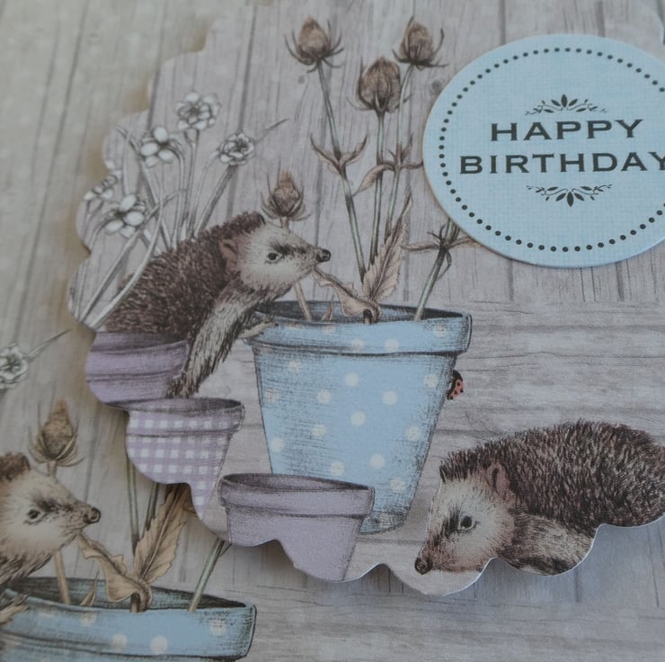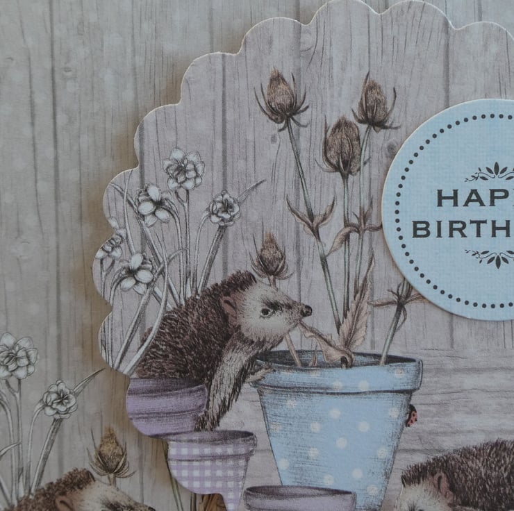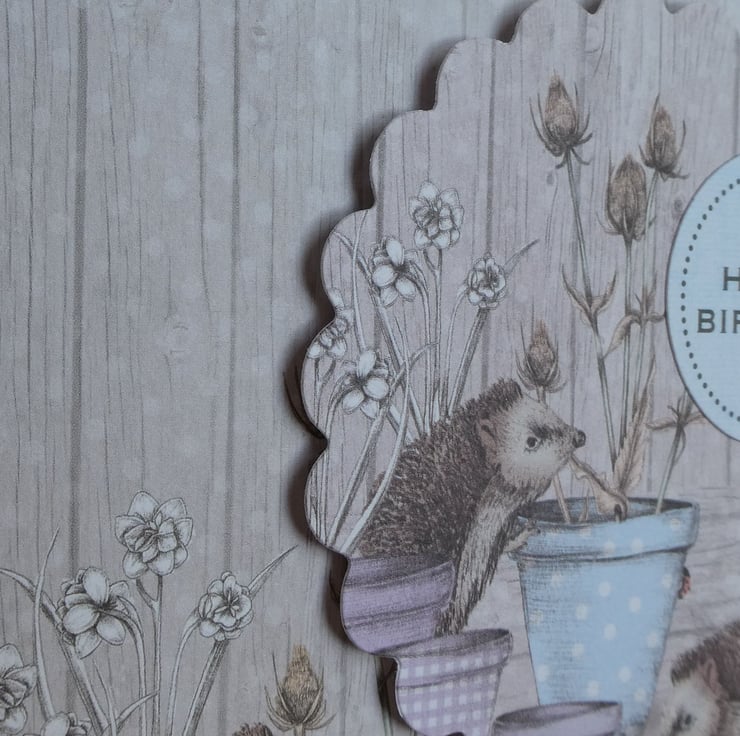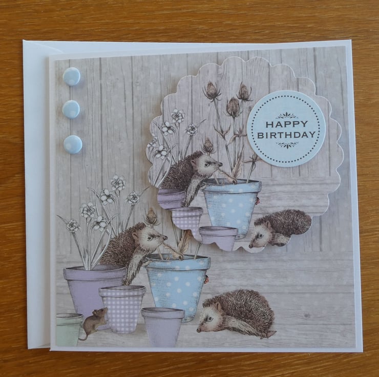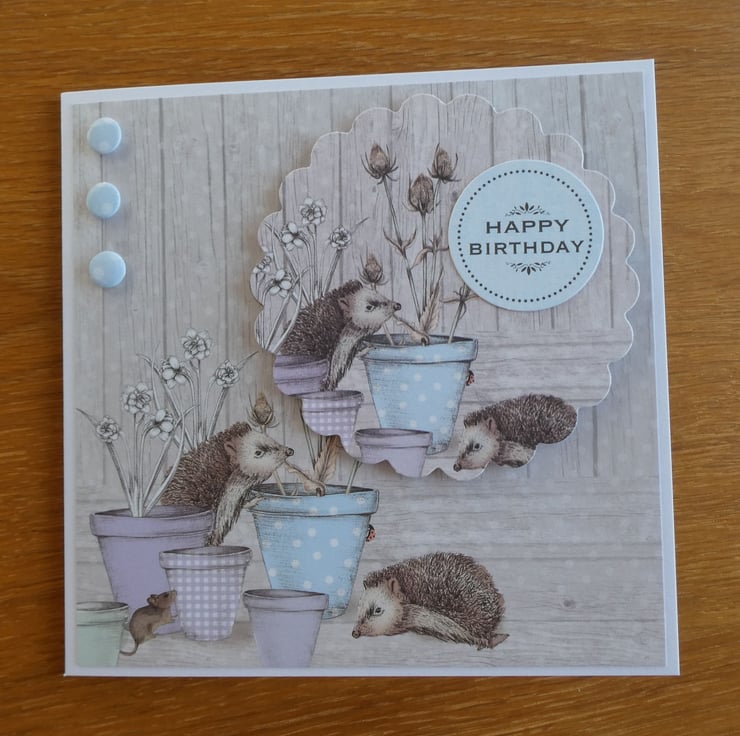This card has a background paper with a wood effect design and an image of hedgehogs and a mouse investigating plant pots in pastel shades of blue and lilac.