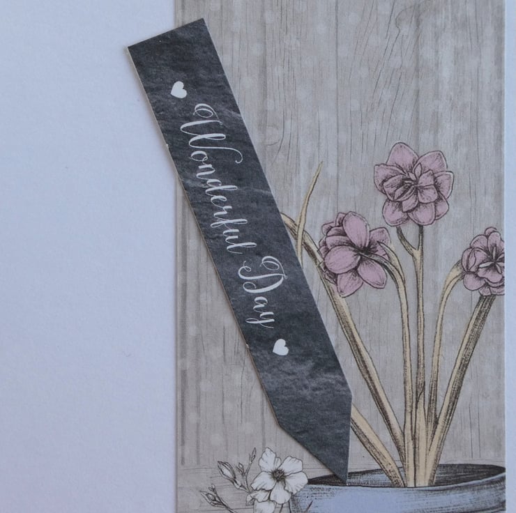 Inside the card is a strip of matching paper with an image of two pots of flowers and a slate grey plant marker style message with the words Wonderful Day, leaving plenty of space for your own birthday message.