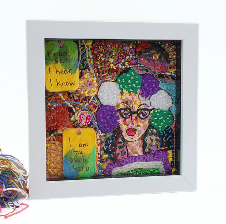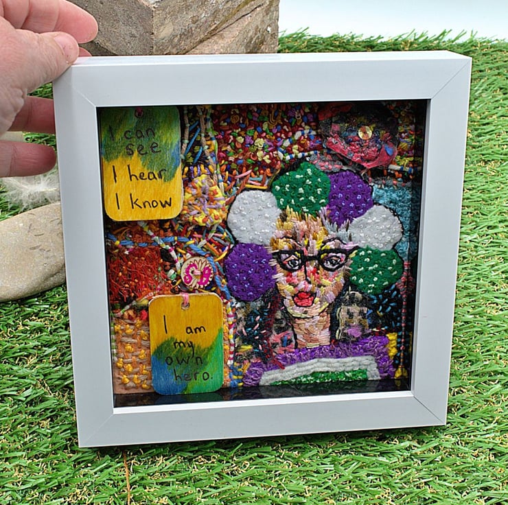 This is an original framed hand stitched work of art. It depicts a feminist along with a couple of quotes from her. The background stitching represents the importance of the environment and nature. Each stitch has been completed by hand using a variety of silk, wool and scraps of cloth.